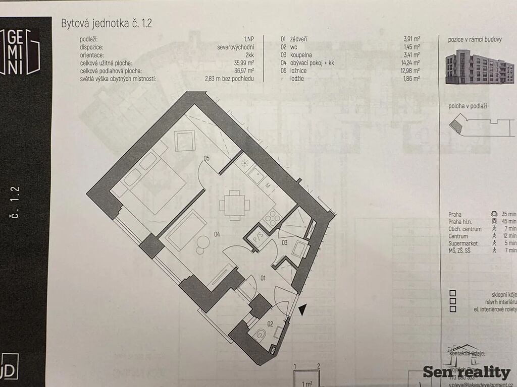 Dispozice bytu tvoří prosvětlený obývací pokoj s kuchyňským koutem vyráběným na míru. Kuchyňský kout je vybaven vestavěnou lednicí a mrazákem, vestavěnou myčkou, vestavěnou horkovzdušnou a mikrovlnnou troubou, indukční varnou deskou s odsáváním, ložnice s vestavěnou skříní a designovým osvětlením, koupelna se sprchovým koutem a elektrickým koupelnovým radiátorem, WC a chodba, ze které je vstup do lodžie o výměře 1,86 m2. K bytu náleží sklep o výměře 3 m2 v suterénu domu. Byt je situován na severovýchod.