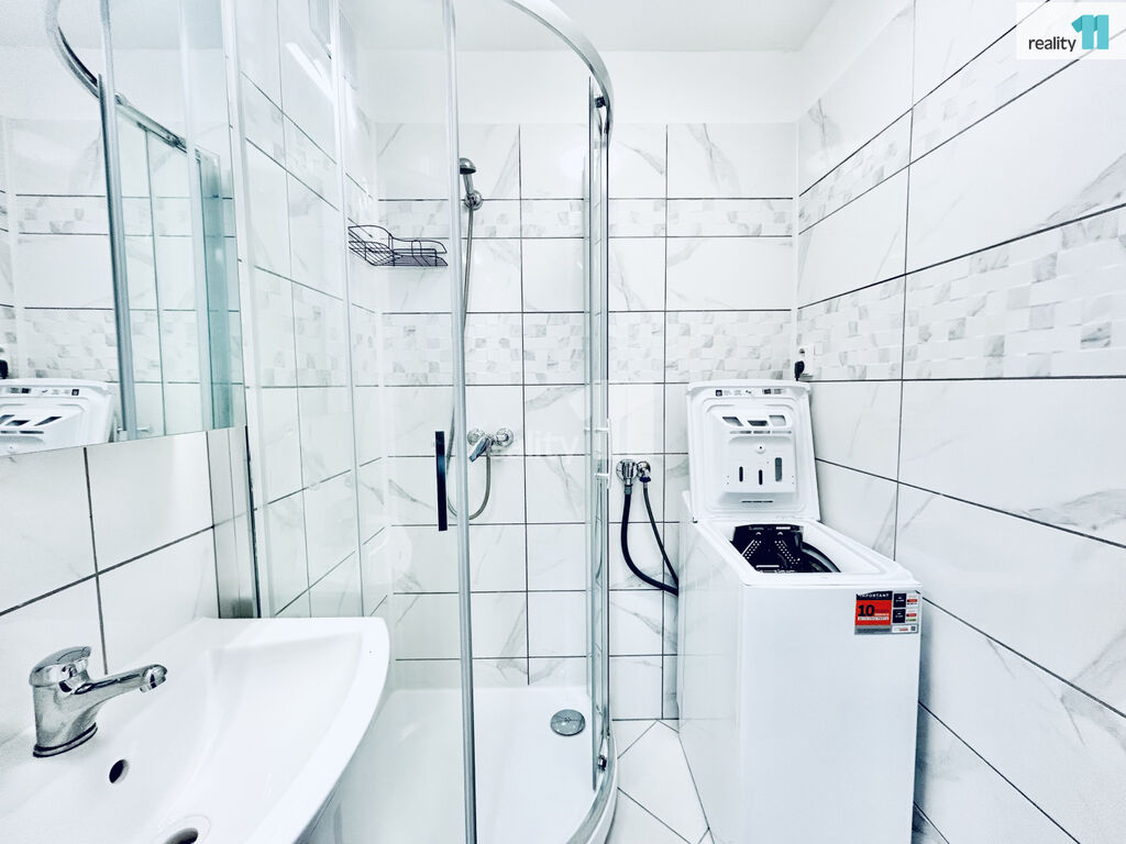koupelna se sprchovým koutem a pračkou, samostatné WC.