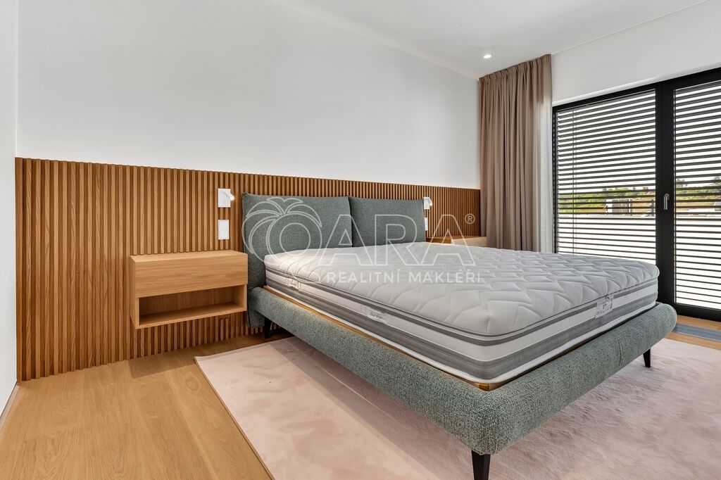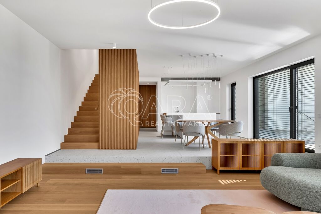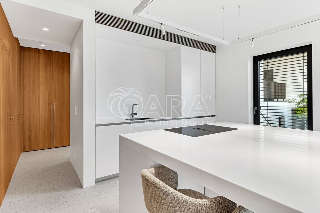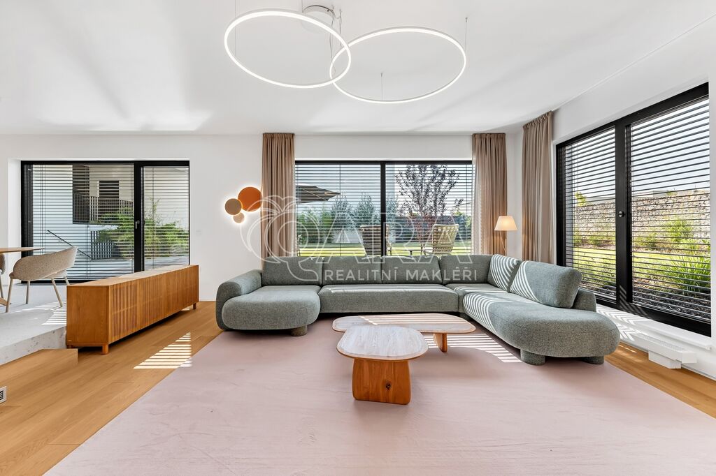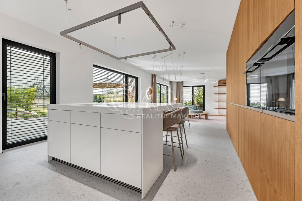 Podlahy jsou vysoce kvalitní dřevěné v kombinaci s luxusní dlažbou formátu 120 x 120. Špičková kuchyňská linka s prostorným ostrůvkem a deskou z umělého kamene je doplněna o vysoce kvalitní spotřebiče zn. Siemens.