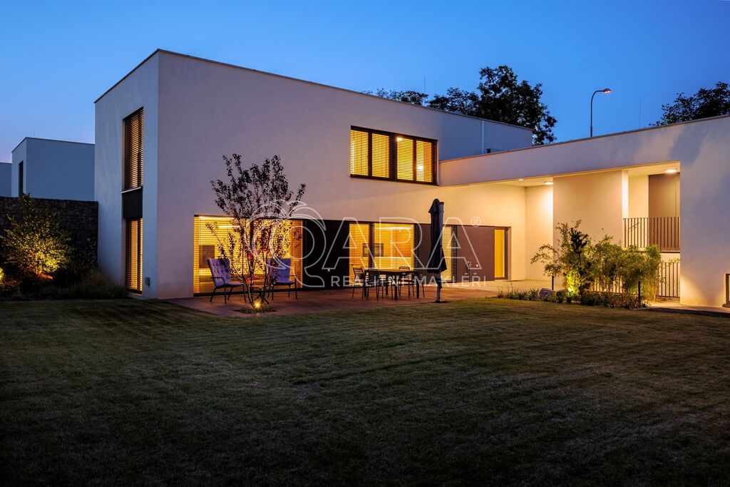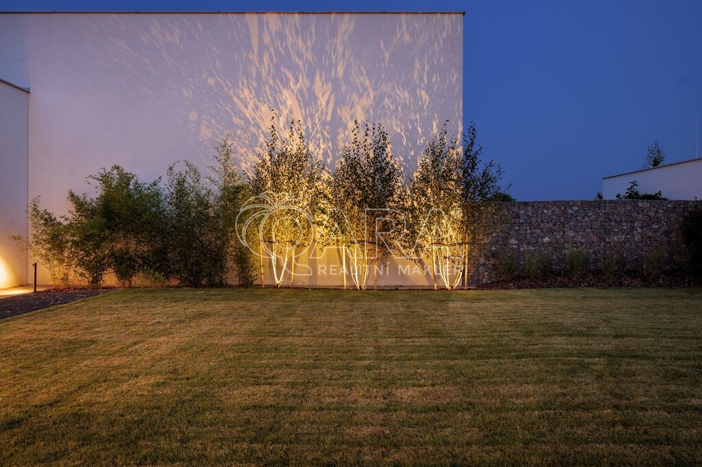 Krásná a prostorná zahrada byla navržena a realizována tak, aby její údržba byla minimální. Její součástí je plně automatická závlaha i venkovní osvětlení, které po setmění promění celý prostor v oázu absolutního klidu a soukromí. Toto místo si jistě zamilujete. Nechybí zde ani příprava pro bazén.