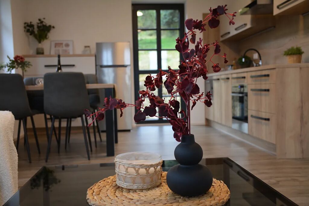 Součástí vybavení je kuchyňská linka na míru se spotřebiči, jídelní stůl se židlemi a v obývací části sedací souprava s konferenčním stolkem. V ložní části pak vysoká postel s matracemi.