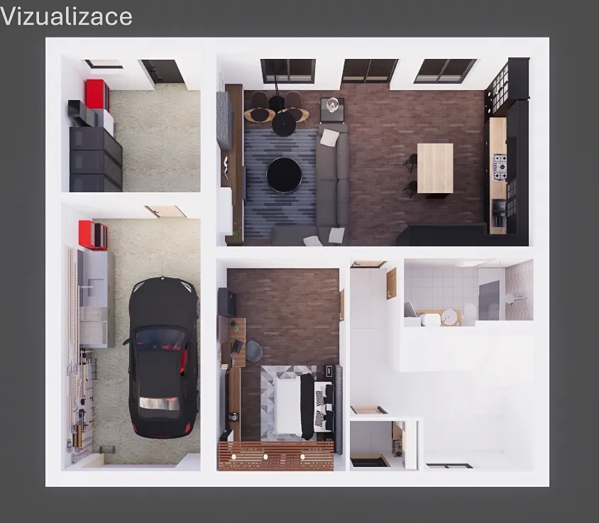 Využívá moderní stavební materiály, nízkoenergetické řešení, kvalitní okna, izolace a příprava pro tepelné čerpadlo.