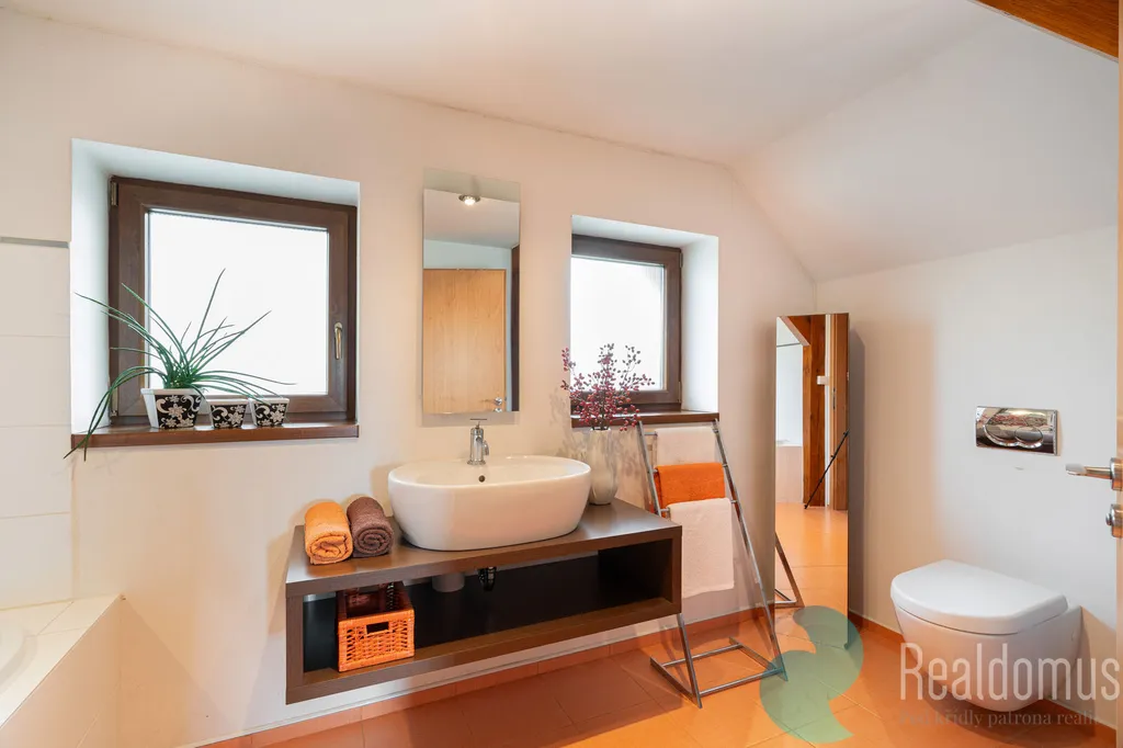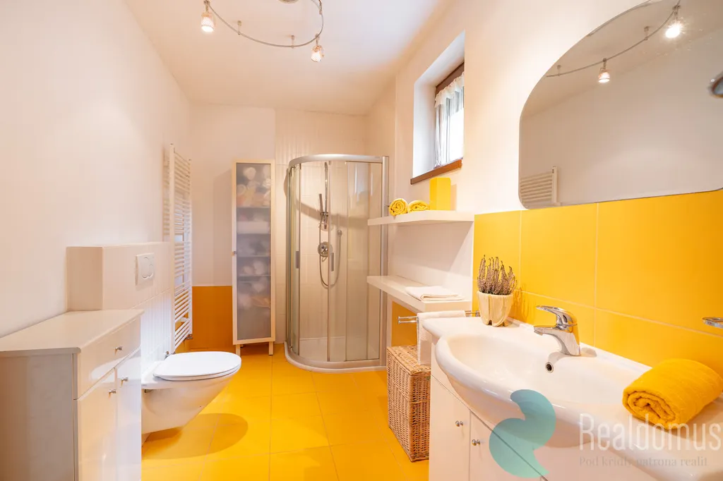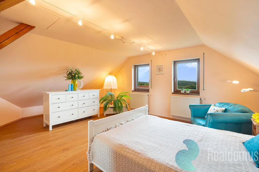Dům je v současné chvíli rozdělen na 2 bytové jednotky. Hlavní bytová jednotka 3kk s velkorysou užitnou plochou 159 m2 se skládá z nádherné prosvětlené hlavní místnosti s kuchyňským koutem o rozloze 56 m2, dvou velkých ložnic (31 m2 a 27 m2), dvou koupelen (7 m2 a 6 m2) a technické místnosti. Druhá bytová jednotka 1kk má obytnou místnost s kuchyňským koutem (31 m2) a koupelnu 6 m2. Oba byty mají společnou chodbu a mohou být součástí jedné bytové jednotky, kdy jedna z ložnic bude mít vlastní koupenu s toaletou. Velký potenciál má toto dělení pro soužití více generací, či odrostlejší děti, které mohou mít v domě své samostatné zázemí.