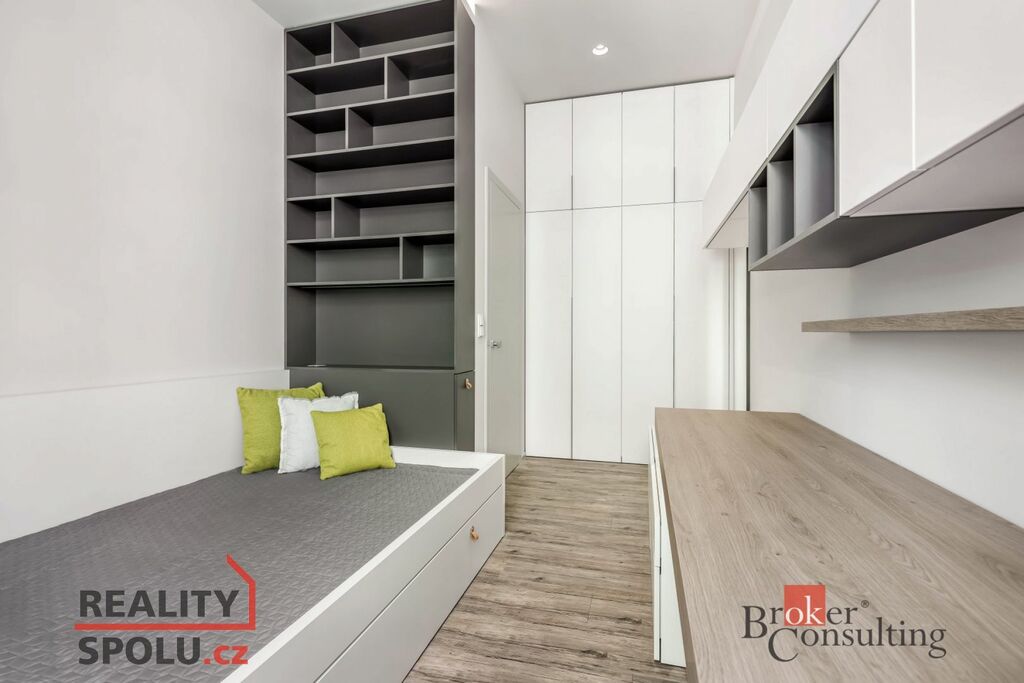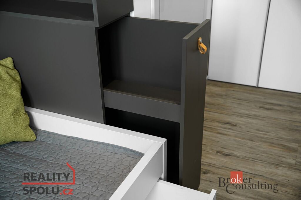Celý dětský pokoj je zařízený nábytkem na míru, s maximálním využití úložných prostor. Policový systém je navržen až do stropu stejně tak i skříň. Dále je zde pracovní stůl a nad ním policový systém, větší postel se vnitřním šuplíkem, který lze použít a jako druhé lůžko.