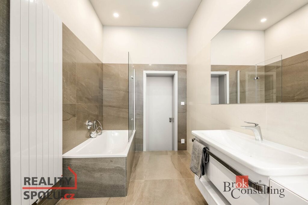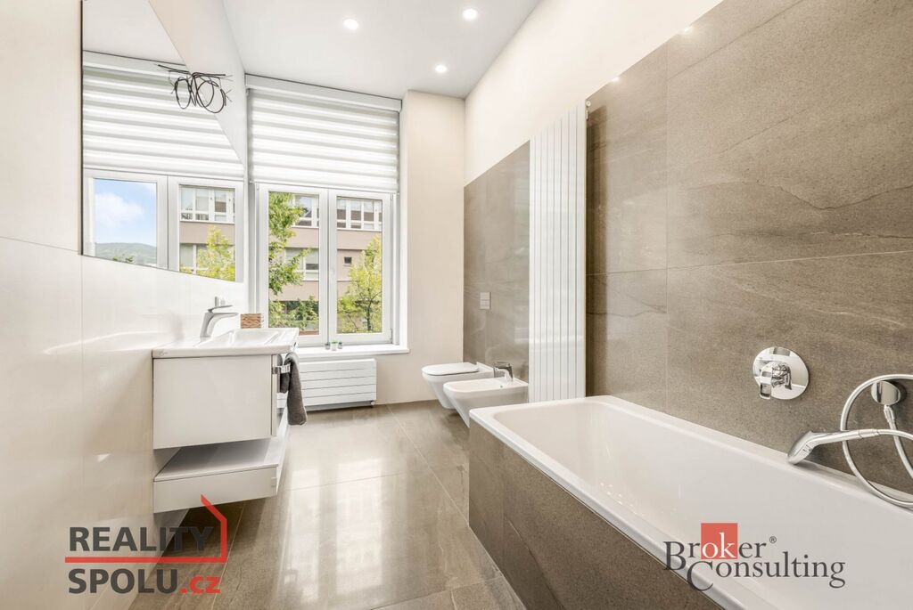 Prostorná koupelna je vybavená vanou se zástěnou, umyvadlem se skříňkou, toaletou a bidetem. Vybavení koupelny je řešeno firmou Ptáček, s.r.o. a jsou voleny vyšší řady zařizovacích předmětů, zn. Kludi, Ideal Standard, Kaldewei.