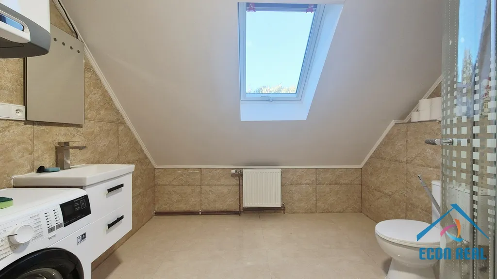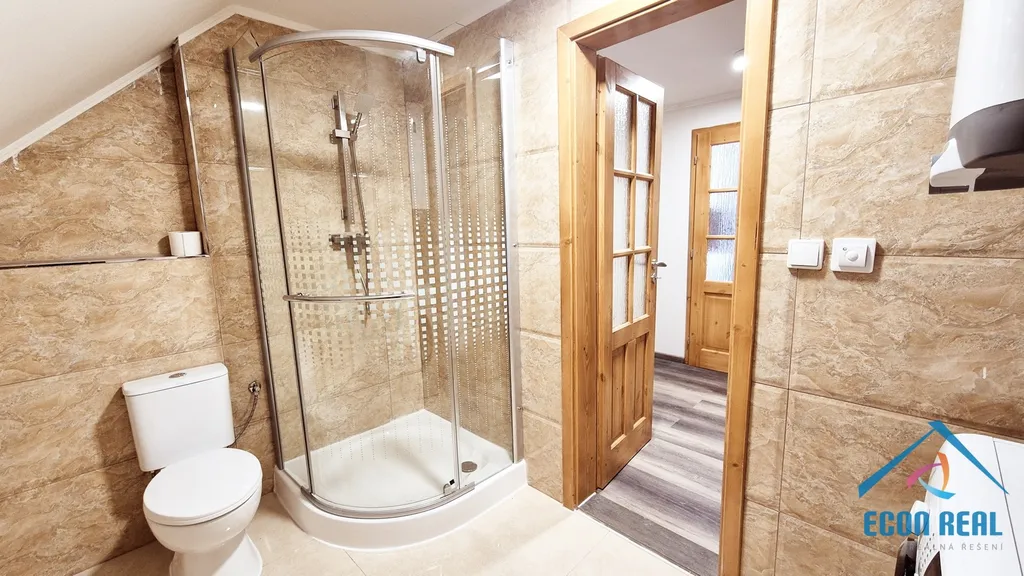 Byt 2kk disponuje větší předsíní, ze které lze vstoupit do zcela nové koupelny se sprchovým koutem, toaletou, umyvadlem se zrcadlem, bojlerem na ohřev teplé vody a pračkou, na odpočinkovou terasu s výměrou 32 m2 nebo do obývacího pokoje s plně vybaveným kuchyňským koutem. Podkrovní ložnice je přístupná z obývacího pokoje pomocí schodů.