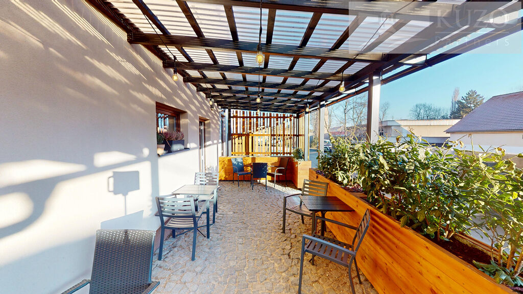 PRODÁVÁ SE KOMPLET: Nemovitost, VLASTNÍ TERASA (bez nájmu městu) a VLASTNÍ PARKOVIŠTĚ pro zákazníky (4 vozy) + 2 místa pronajatá od města.