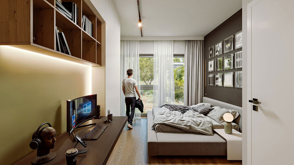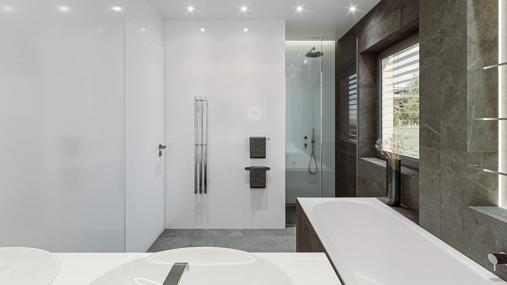 • Luxusně zařízená koupelna dle vizualizací (vana, sprchový kout, podomítkové baterie, dvojité umyvadlo, osvětlené zrcadlo, topný žebřík, nika)