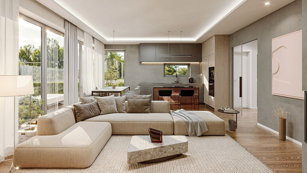 • Prostorný obývací pokoj s kuchyní (31 m²) propojený prosklenou stěnou po celé délce na terasou a zahradou