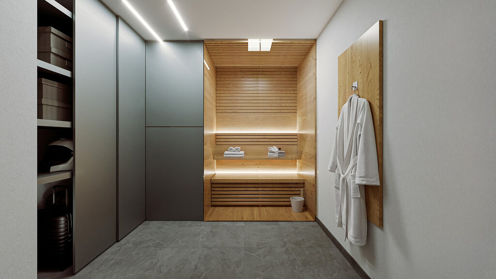 • Technická místnost se sprchou, toaletou a privátní saunou