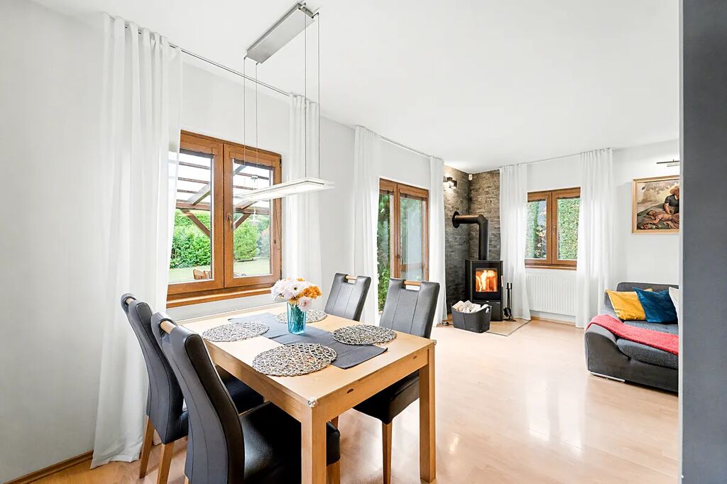 Poté se nám otevře prostor zádveří, ze kterého vejdeme do prostorného obývacího pokoje s kuchyní a krbem (33 m2), který dodává domovu teplo i atmosféru. Z útulného obývacího pokoje je přímý vstup na krytou terasu (17 m2) a krásně udržovanou zahradu. Oceníte zde příjemné posezení nejen v jarních v letních měsících.