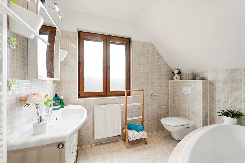 Druhá koupelna s vanou a toaletou (5,72 m2) doplňuje komfort celého patra. V koupelně radiátor a topný žebřík.