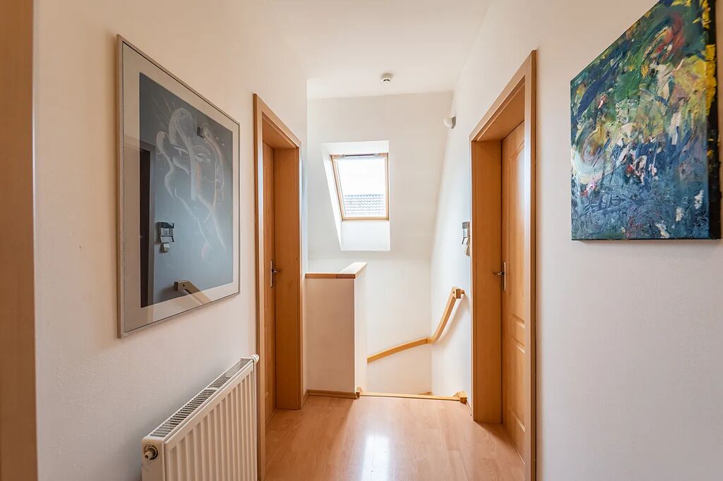 V patře domu se nachází tři pokoje, šatna a druhá koupelna s vanou a toaletou.