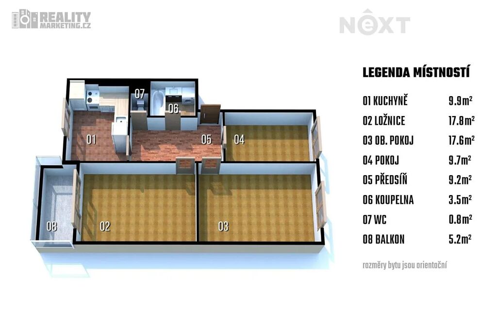 ložnice – 17,8 m² (se vstupem na zasklenou lodžii 5,2 m², ideální místo pro ranní kávu nebo večerní odpočinek s výhledem do klidného okolí).