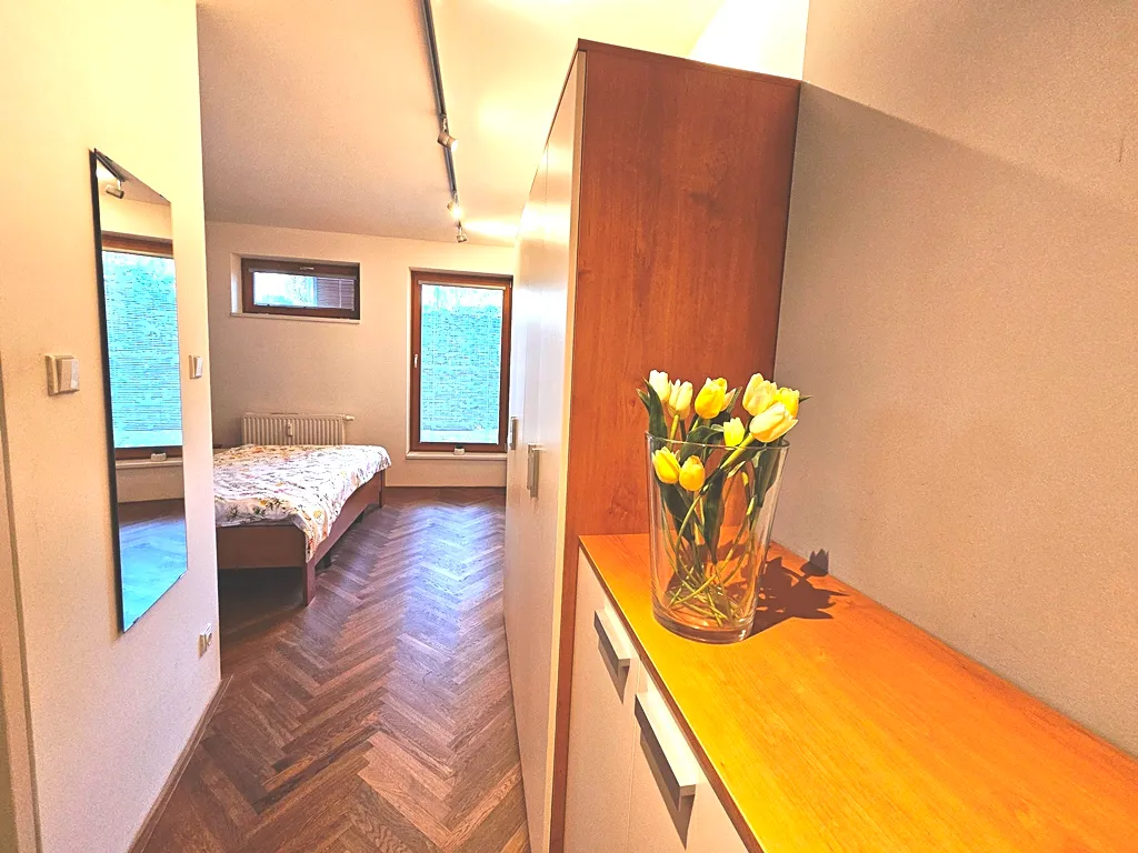 Z bytu je výhled přes potok do zeleně rozsáhlého přírodního parku.