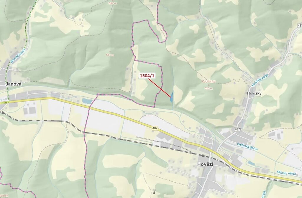 Lesní pozemek o výměře 2626 m2, parcelní číslo 1504/1, podíl 1/1, katastrální území Hovězí, obec Hovězí, obec s rozšířenou působností Vsetín, okres Vsetín, Zlínský kraj.