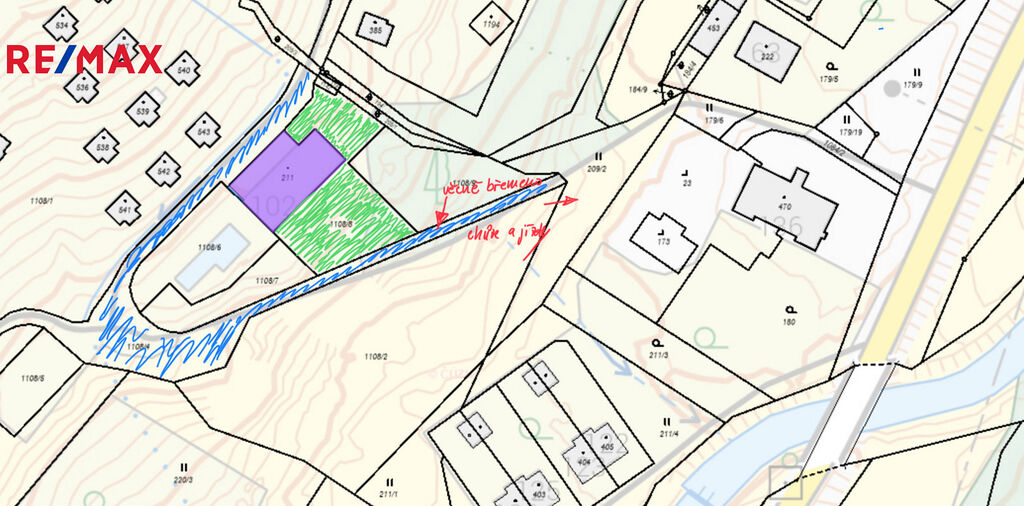 Před budovou je prostorná terasa po celé délce, od asfaltové příjezdové cesty je oddělená živým plotem. Příjezdová komunikace je zatížena věcným břemenem chůze a jízdy ve prospěch prodávaného objektu. Ten je bez jakéhokoliv omezení vlastnického práva.