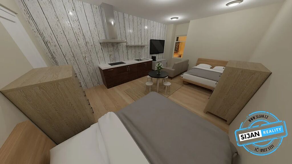 Součástí nabídky jsou i vizualizace přestavby penzionu na moderní apartmány s wellness a barem, které naznačují možný směr rozvoje této atraktivní nemovitosti.