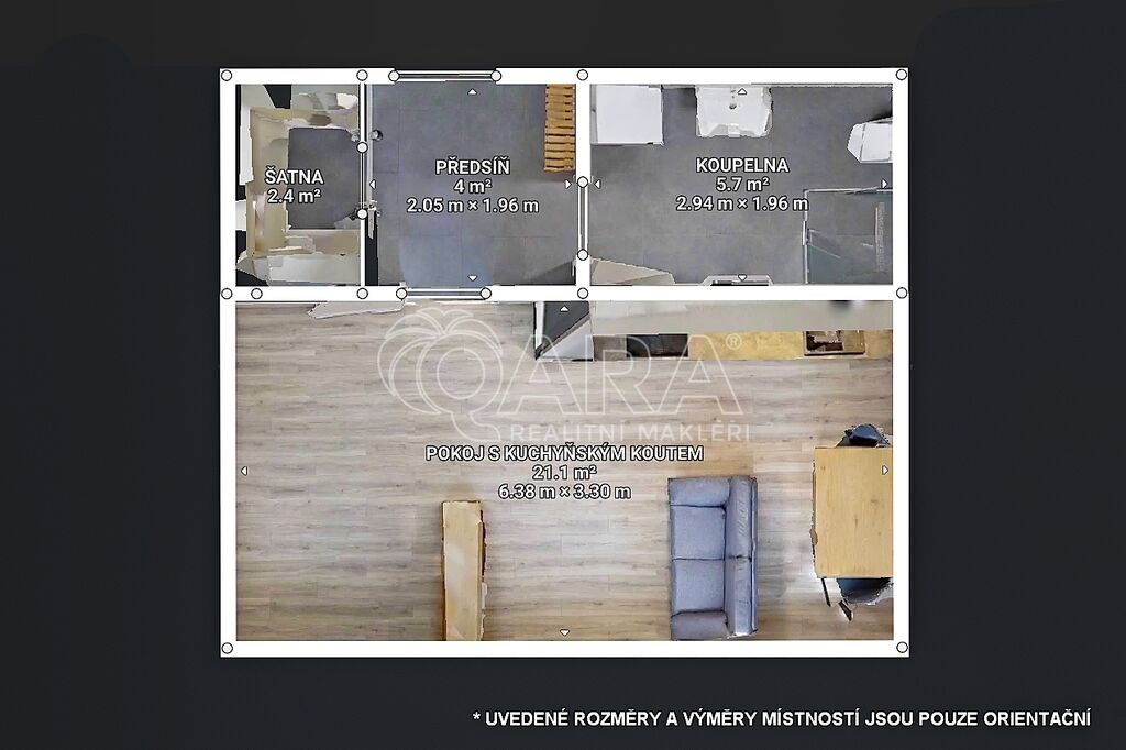 Byt je zařízený dle fotografií, stačí si pořídit pouze postel dle vlastních představ, případně drobný doplňkový nábytek a můžete ihned bydlet.
