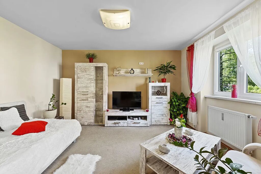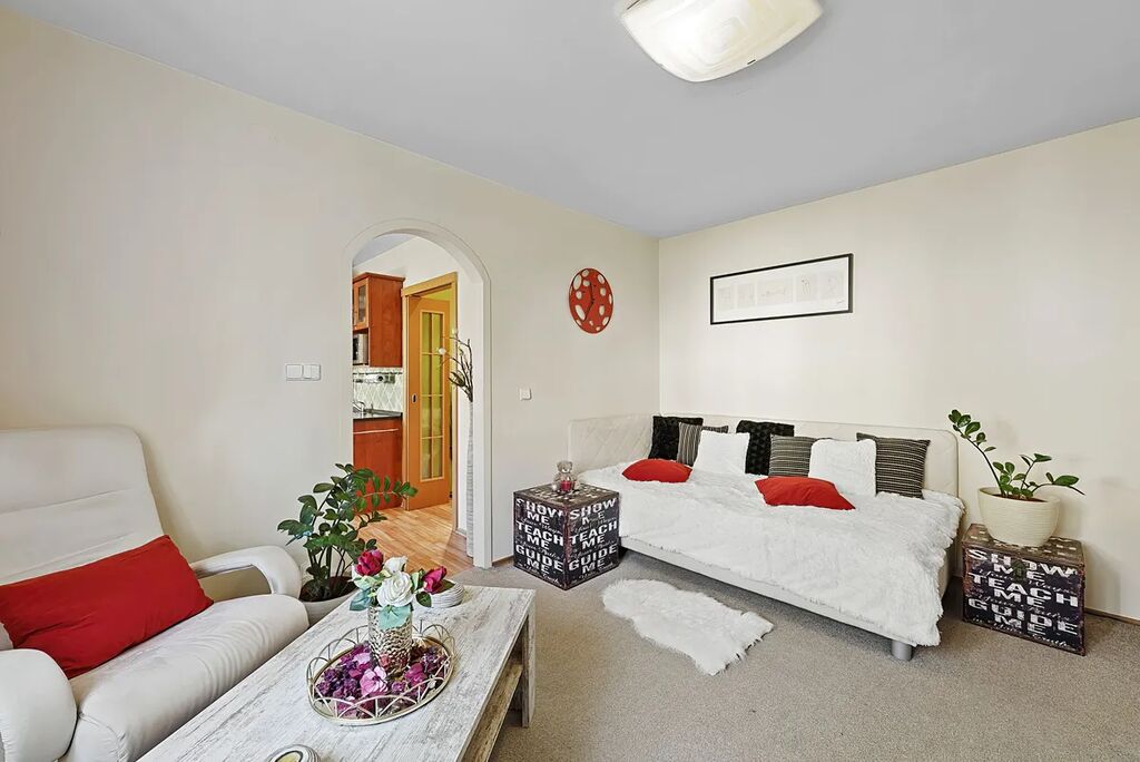 Byt se skládá z prostorné obývací části s kuchyňským koutem, který je plně vybaven, chodby s úložným prostorem, koupelny se sprchovým koutem a toalety. K bytu náleží také sklepní kóje. Parkování je možné před domem.