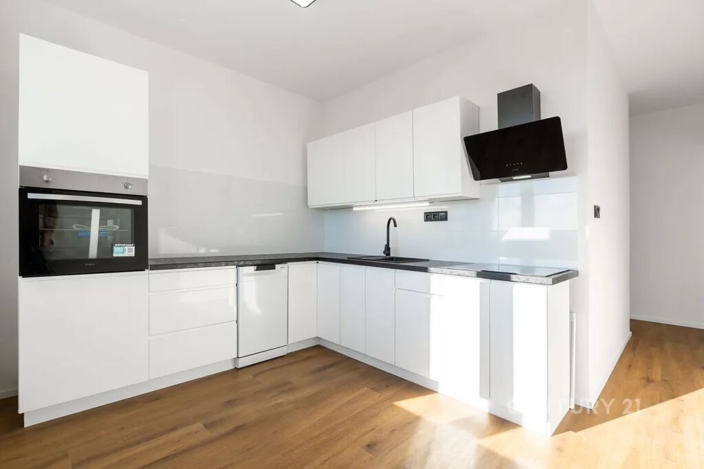 • Moderní bílá lesklá kuchyňská linka s vestavnými spotřebiči (myčka, elektrická trouba, sklokeramická deska a digestoř)
