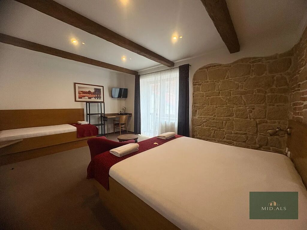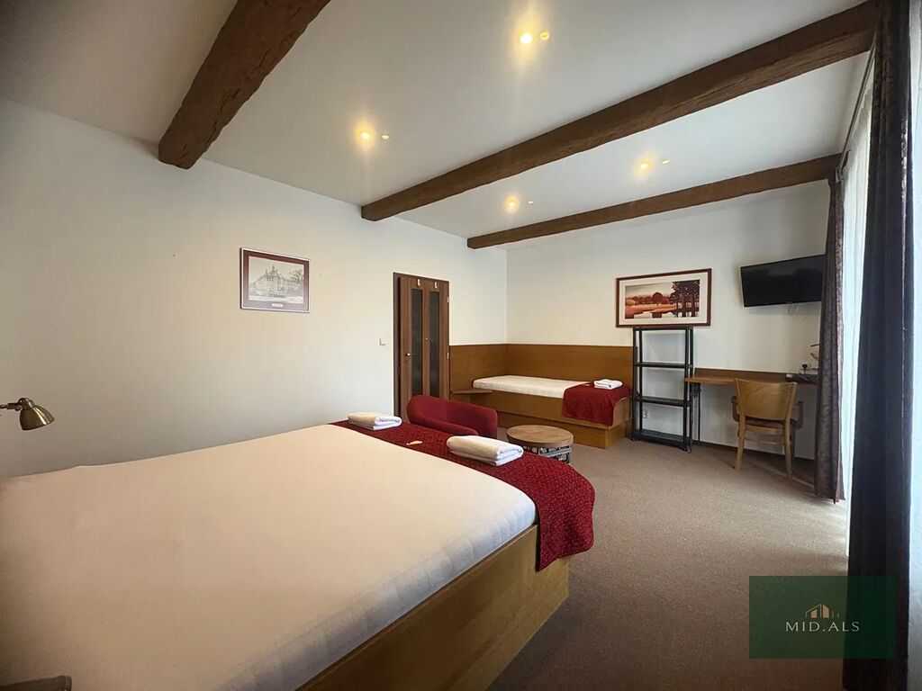 Ložnice : 1x dvoulůžko s nočními stolky, 1x jednolůžko, šatní skříň, stolek se židlí, TV, závěsy, záclony.