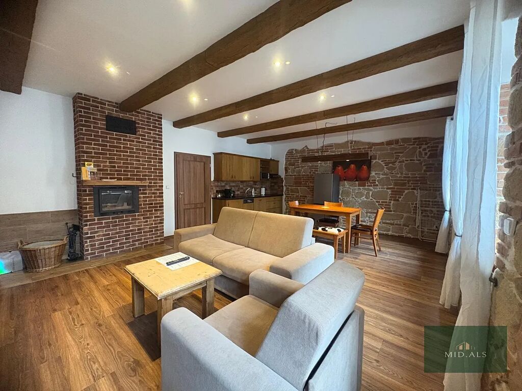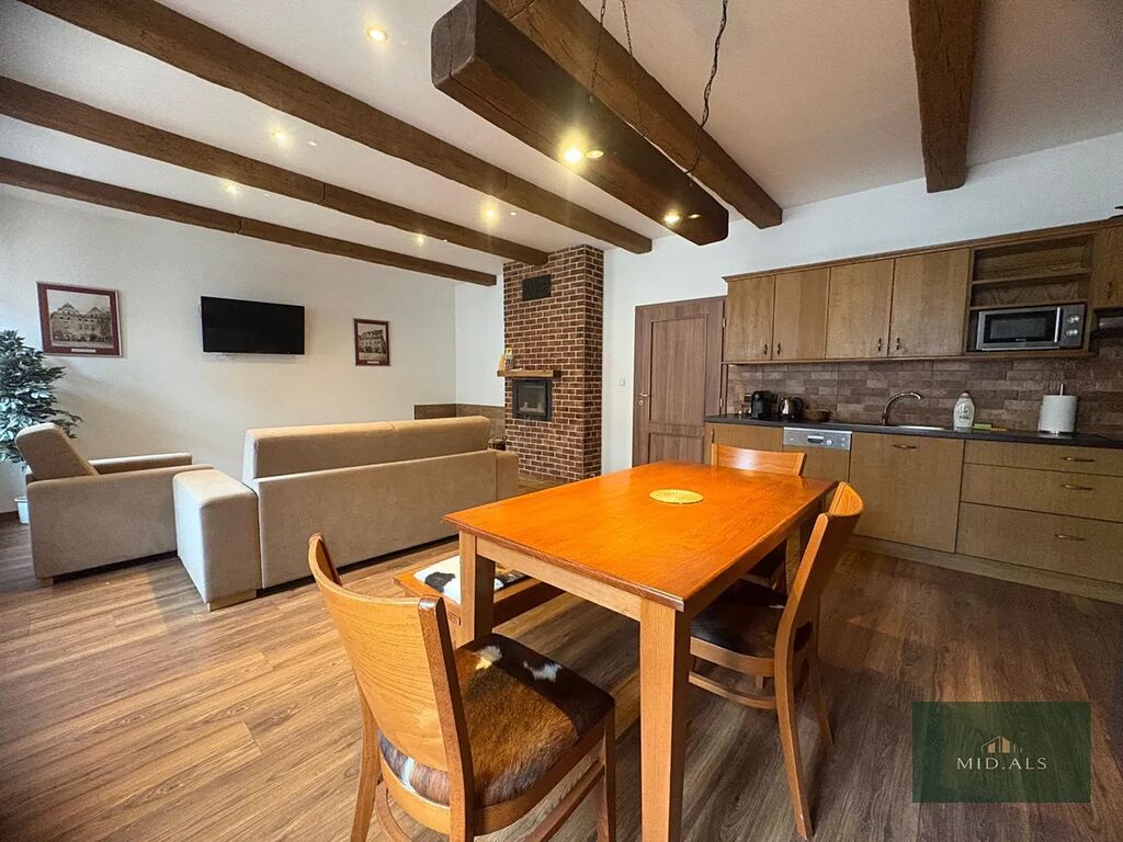 Obývací pokoj s kuchyňským koutem : rozkládací pohovka, křeslo, konferenční stolek, jídelní stůl se židlemi a lavicí, TV. záclony, lednička s mrazákem, mikrovlnná trouba, indukční varná deska, pračka. Opravdu se nájemník může ihned nastěhovat.