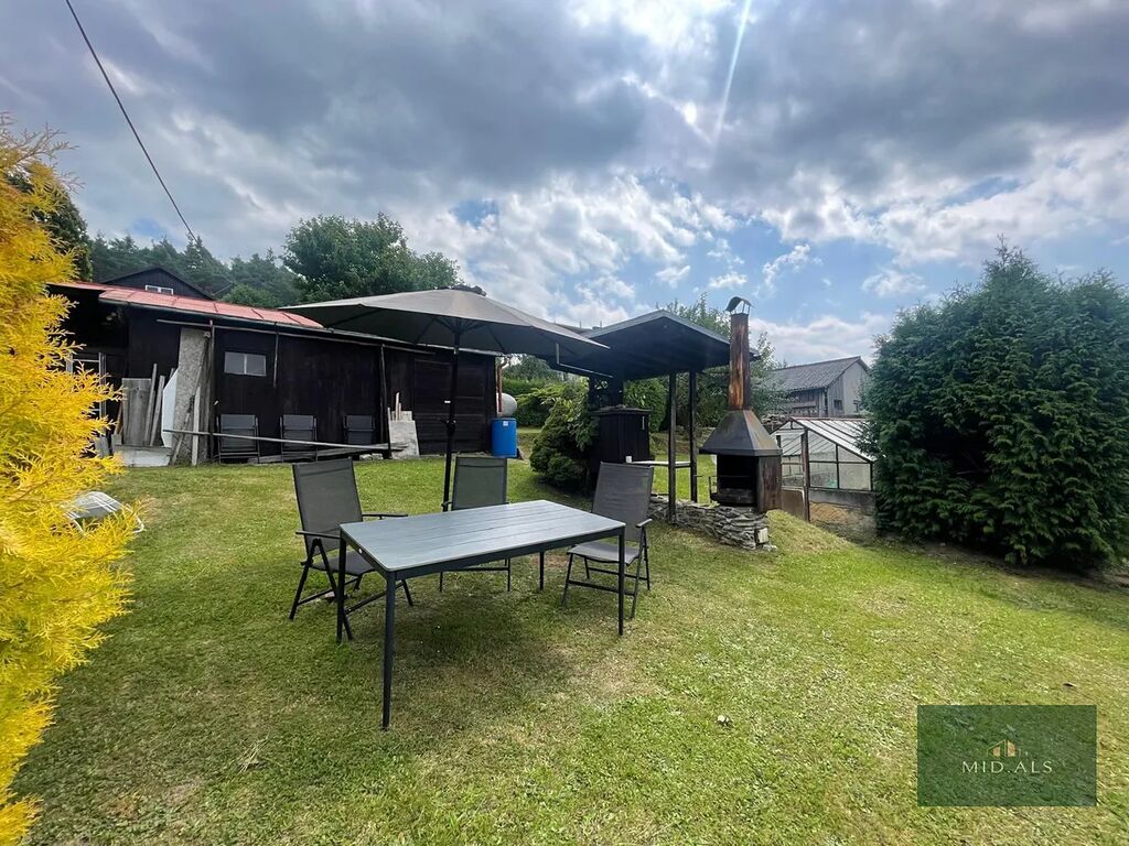 Na zahradě se nachází dřevník, krb s posezením, skleník, malé jezírko, několik ovocných stromů.