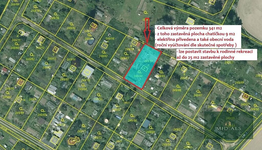Zahrádka má celkovou výměru 341 m2, z toho zastavěná plocha zahradním domkem je 9 m2.