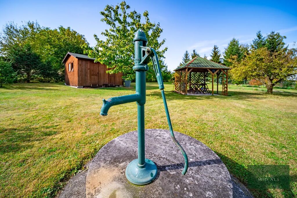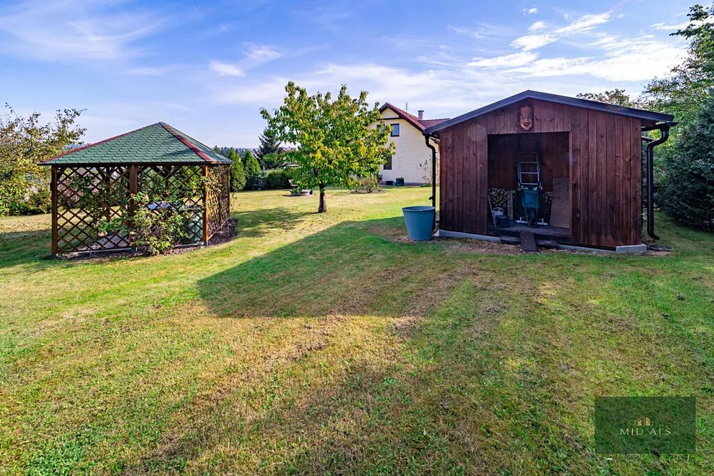 - na krásnou udržovanou a zavedenou zahrádku s altánkem s posezením, ovocnými stromy a keři, zahradním domkem na nářadí, roztomilým jezírkem, záhonky a příjezdovou cestu od plotu k domku,