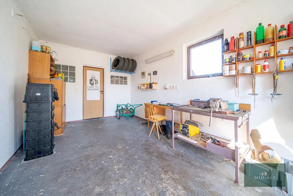 Ze zahrady se vchází do dílny - možno užívat jako sklep, a do garáže.