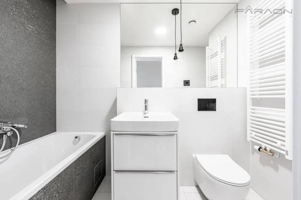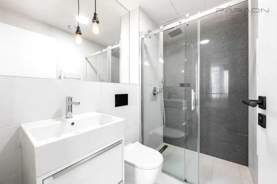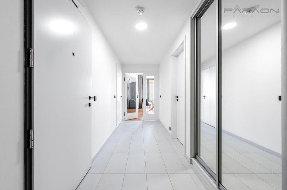 Dispozice moderního bytu 3kk zahrnuje otevřený koncept obývacího pokoje, jídelny a kuchyňského koutu, dvě ložnice, dvě koupelny, velkorysou vstupní chodbu, v ceně parkovací místo přímo v budově přístupné výtahem a sklep.