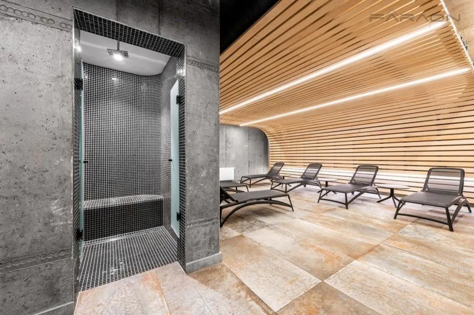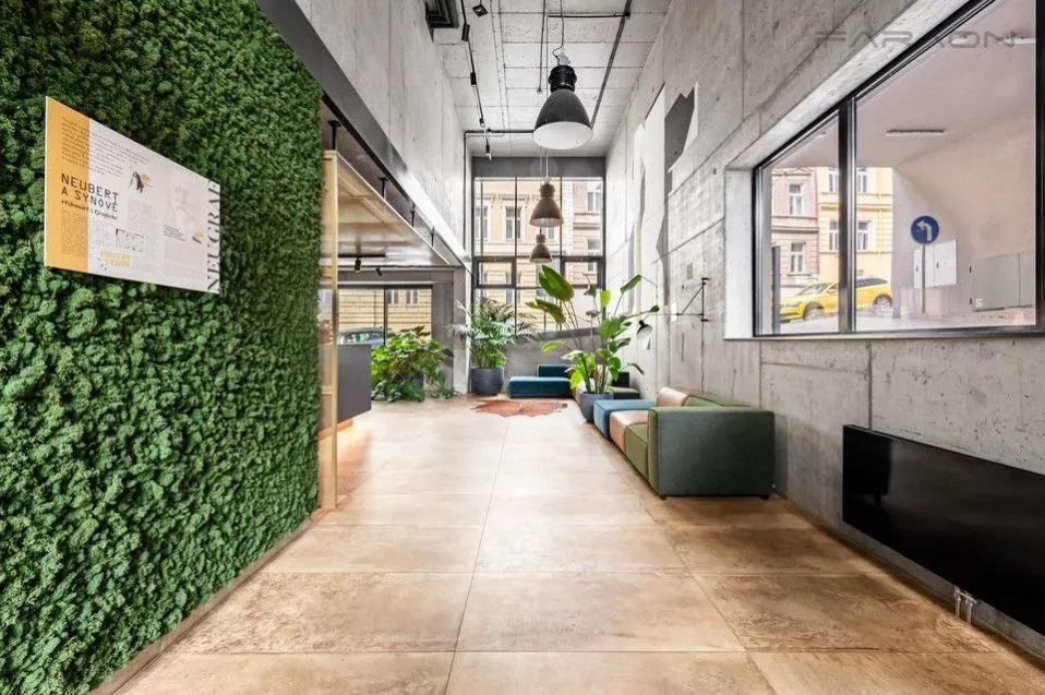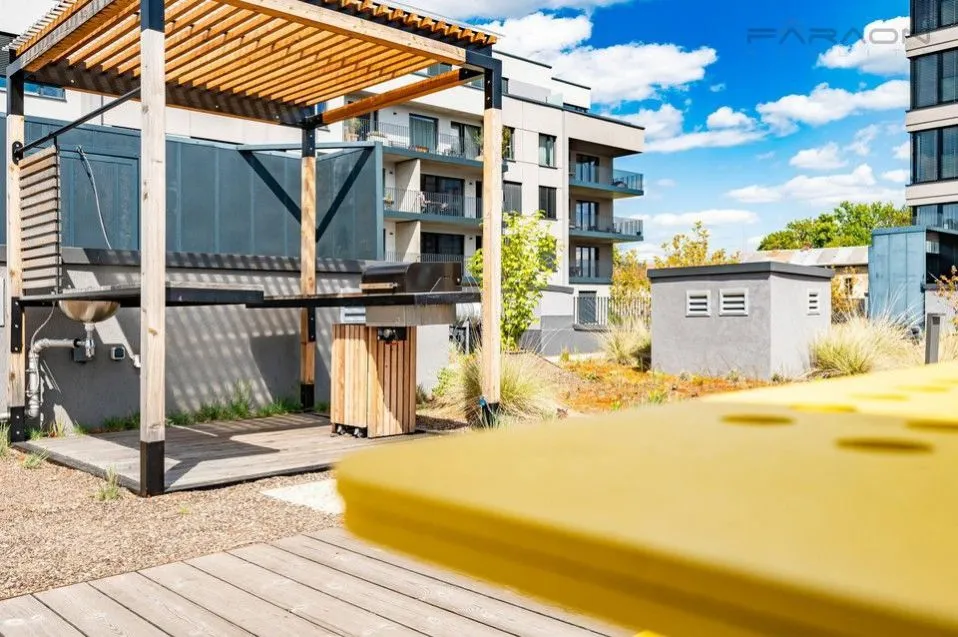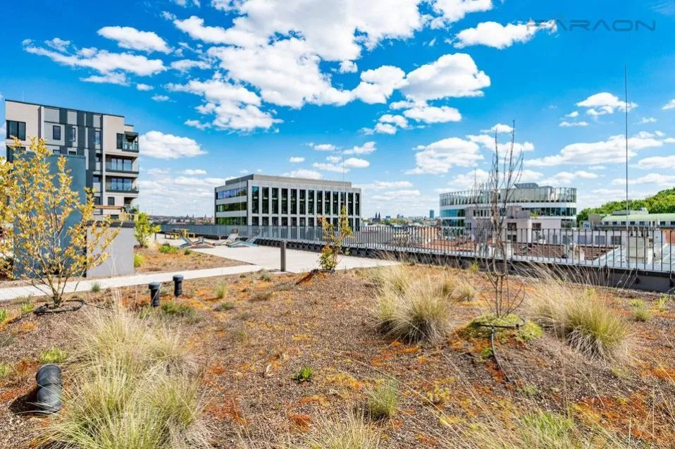 Cena nájmu zahrnuje parkovací stání s možností dobíjení elektromobilu, 24/h recepce s ostrahou, soukromé wellness, terasovitá střecha, vnitřní zahrada plná zeleně, kavárna, společná prádelna a coworkingové centrum.