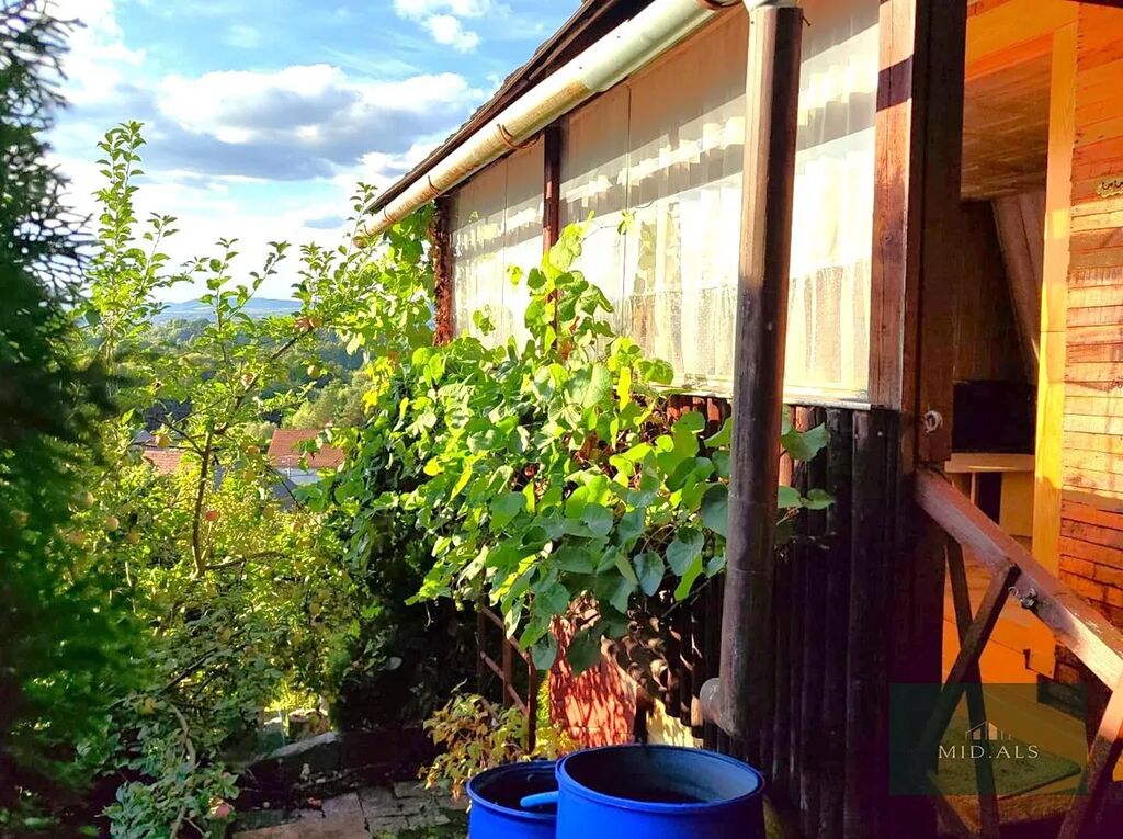 Zahrada je umístěná na jihozápadní slunné stráni, takže zde máte slunce po celý den. Prosklená veranda v patře i otevřené zápraží v přízemí nabízí krásný výhled na celé město a úchvatné západy slunce. V místnosti v patře chatky lze topit krbem.