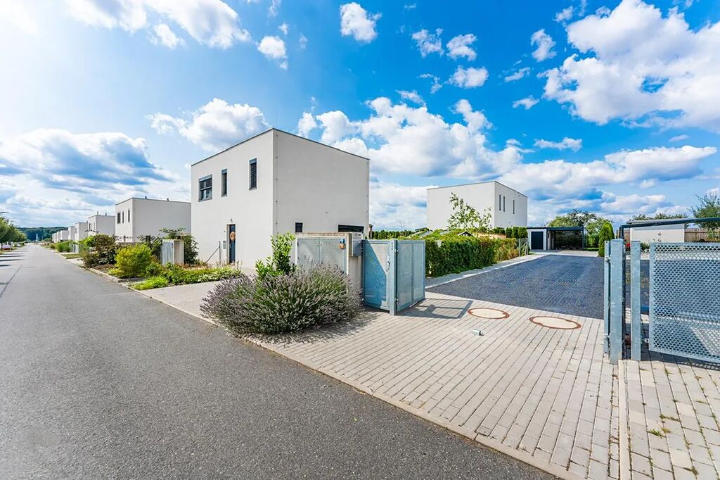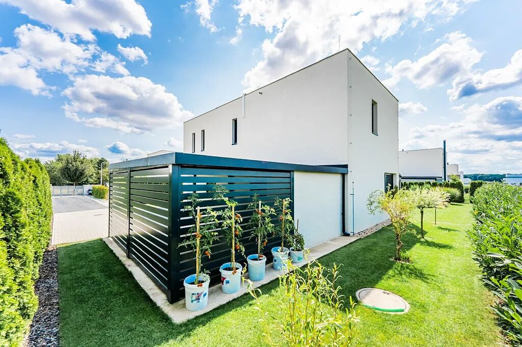 Před domem se nachází prostorná zahradní místnost vhodná na umístění kol, zahradního náčiní nebo venkovních hraček pro nejmenší a kryté venkovní stání pro druhý automobil.