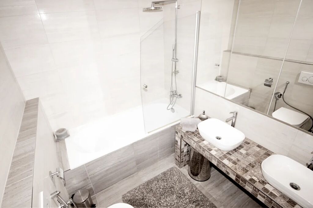 2 koupelny a samostatné WC: V bytě jsou dvě plně vybavené koupelny a samostatná toaleta pro hosty.