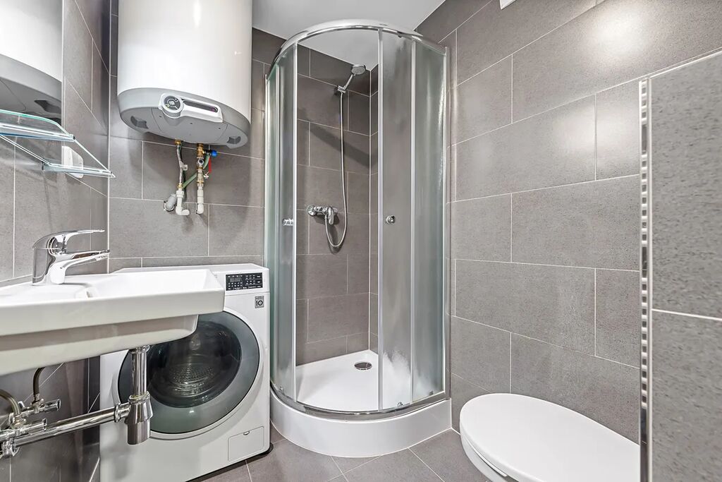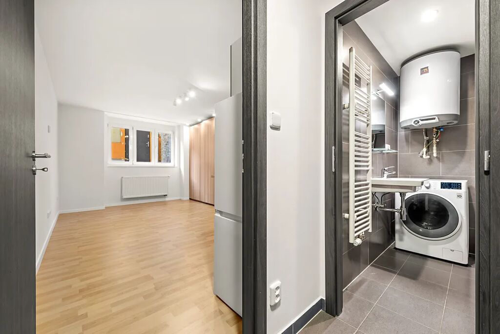 Součástí vybavení je kuchyňská linka včetně spotřebičů, pračka a dostatek úložných prostor.