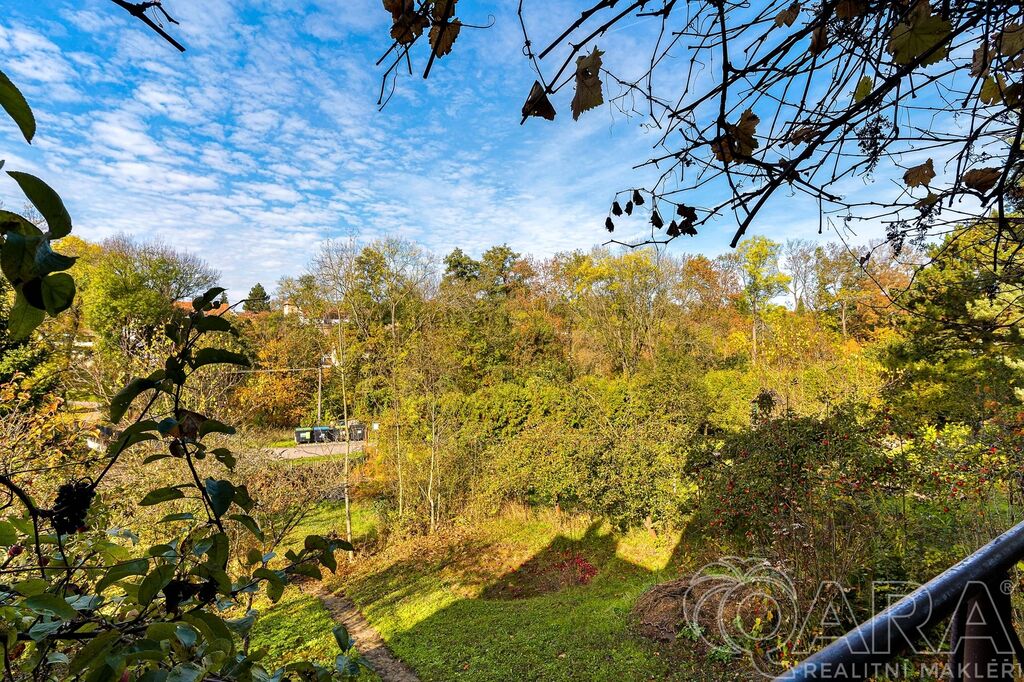 Zahrada je orientovaná na jih, mírně svažitá, s několika vyrovnanými místy vhodnými pro posezení se slunečníkem nebo bazének. Na hranici pozemku rostou ovocné stromy, především jabloně, a podél plotu vinná réva a ostružiny. Ze zahrady je příjemný výhled na protilehlý svah a přilehlou loučku, na které je nově vybudované dětské hřiště.