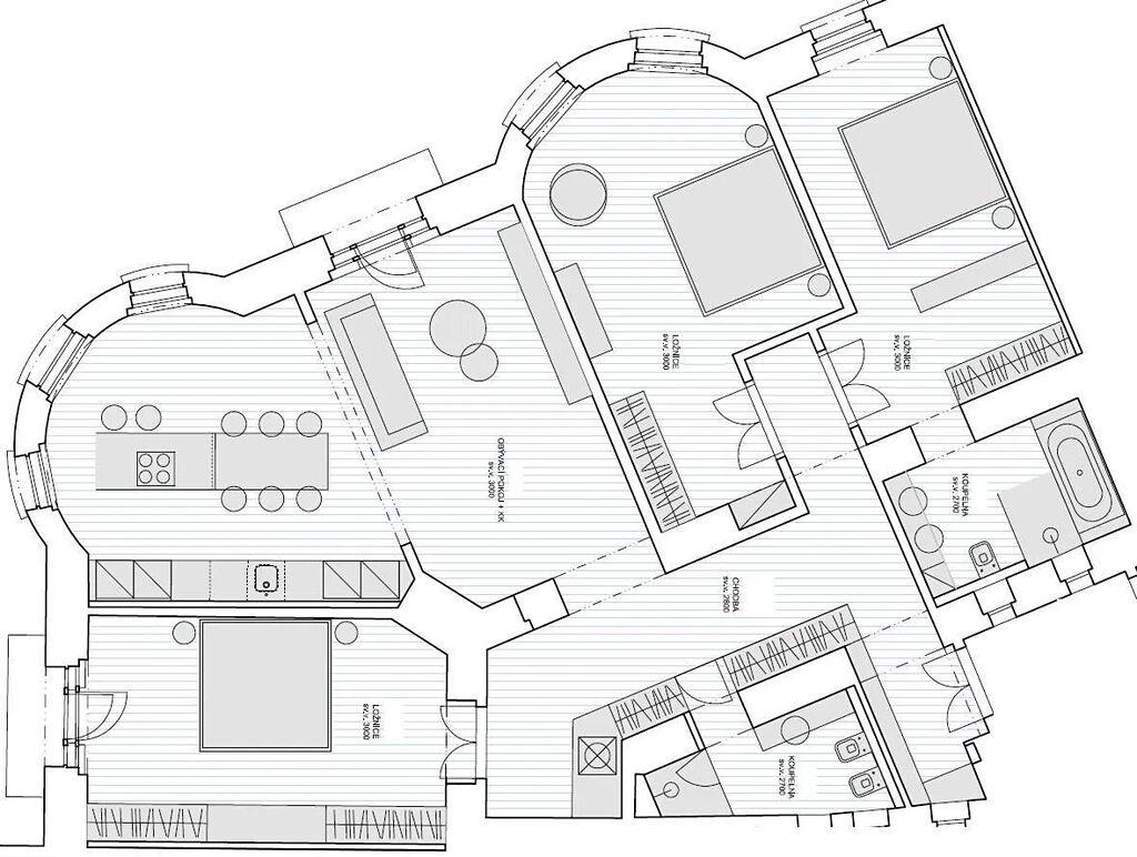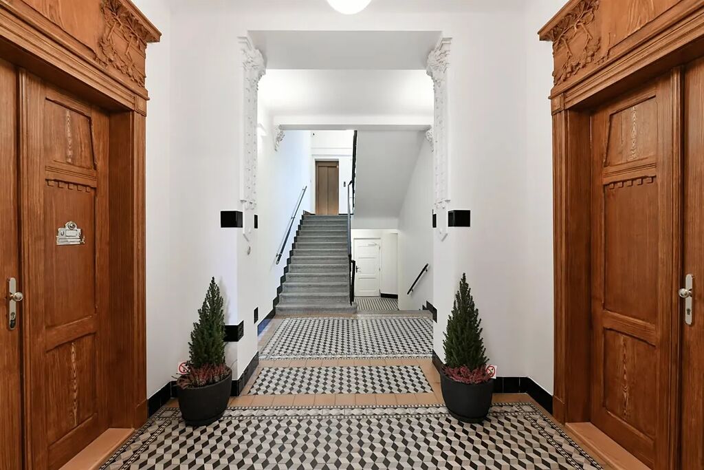 Designový byt 4+kk (3 ložnice, 2 koupelny) se dvěma balkony a klimatizací, o celkové obytné ploše 170 m2, je situován v 1. patře zrekonstruované secesní budovy s výtahem v populární rezidenční lokalitě Praha 2 Vinohrady, ulice Laubova.