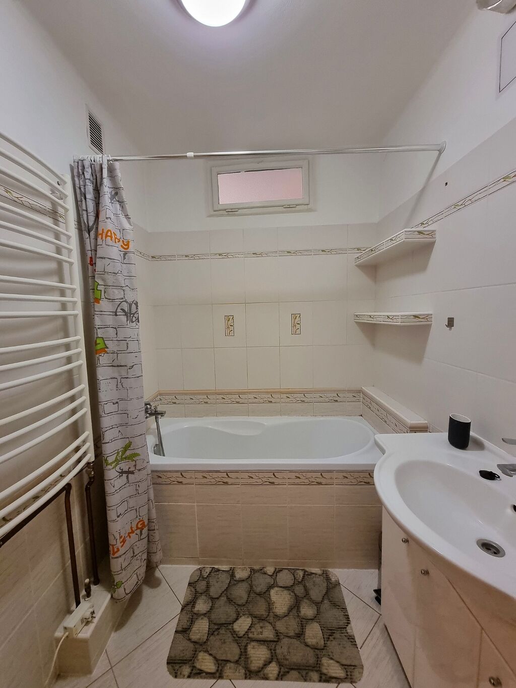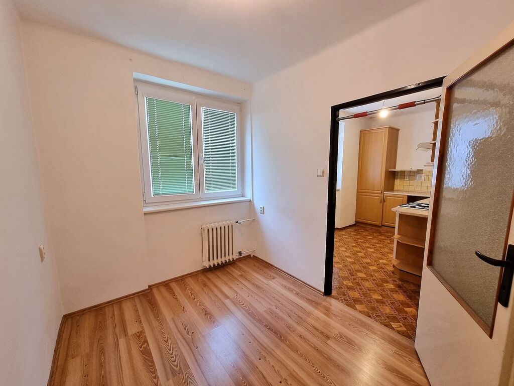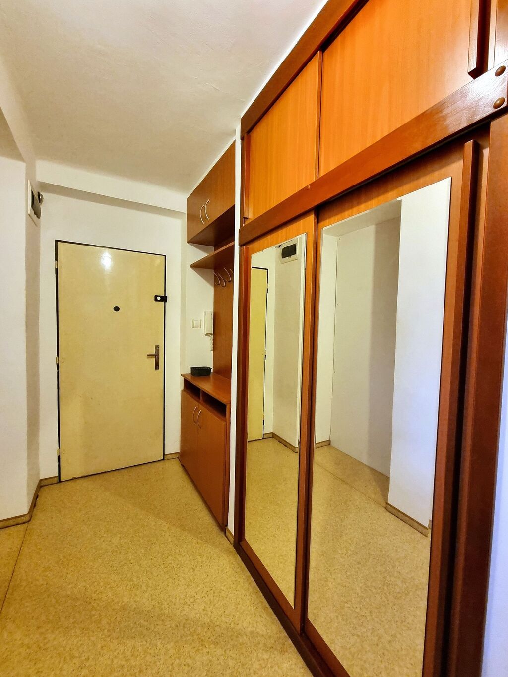 Byt se nabízí k pronájmu částečně zařízený. Chodbou, kde jsou vestavěné skříně s věšákem a úložné skříňky, se vstupuje do jednotlivých místností, kromě ložnice, kam se prochází z kuchyně. V kuchyni je kuchyňská linka vybavena lednicí s mrazákem, plynovým sporákem, elektrickou troubou a digestoří. V koupelně je vana, umyvadlo se skříňkou, topný žebřík, poličky a příprava pro pračku. WC je samostatné. Dále je z chodby vstup do obývacího pokoje, který je situovaný do vnitrobloku. Podlahy jsou laminátové plovoucí, PVC nebo dlažba. Do bytu je přiveden internet a TV. Teplo je zajištěno dálkovým systémem, ohřev vody zajišťuje elektrický bojler umístěný v koupelně.