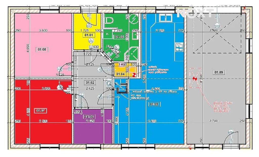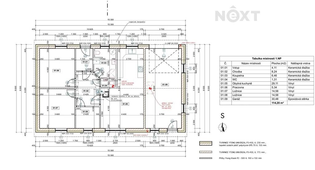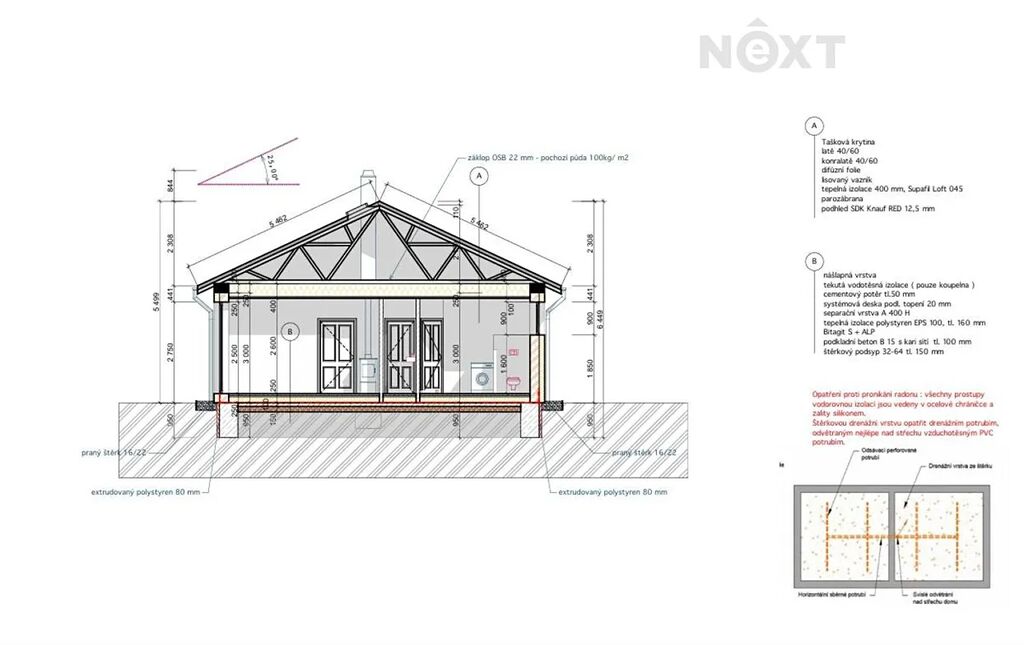 Exklusivně vám nabízíme prodej nízkoenergetického bezbariérového rodinného domu 3+kk s garáží, dílnou a pracovnou o zastavěné ploše 137m² na rovinatém jižním pozemku o celkové výměře 836 m² v okrajové části města Mělník. Dům je ve stavu hrubé stavby s tím, že rozpočet k dodělání je cca 2,7 - 3 miliony Kč (dle použitých materiálů). Obvodové zdivo je postaveno z izolačních tvárnic YTONG Lambda o síle 45 cm, a dál se již nemusí zateplovat. Okna a dveře jsou plastová ze špičkových německých profilů Gealan s hloubkou rámu 90 mm a jsou zasklena termoizolačními trojskly (0,77 W/K. m²). Okna a dveře jsou z vnější strany provedena v módní antracitové barvě a vhodně tak ladí se střechu z betonových tašek BRAMAC stejné barvy. Dům je napojen na městský vodovod, kanalizaci a elektřinu.