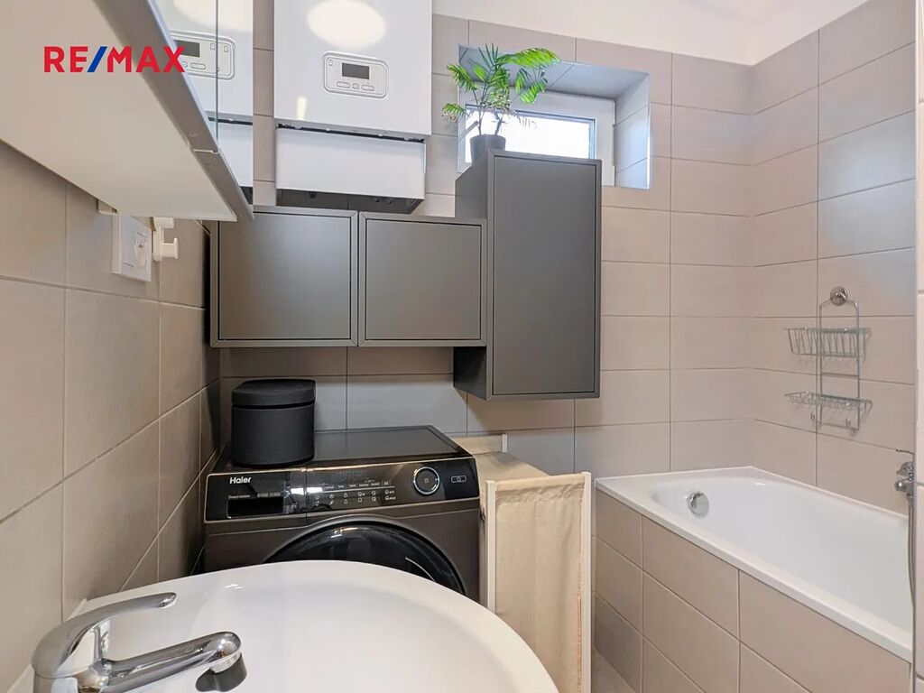 Koupelna je vybavena vanou, toaleta je samostatná. O komfortní teplo se stará podlahové vodní vytápění s elektrickým kotlem, ohřev vody zajišťuje elektrický bojler. Součástí prodeje je moderní kuchyňská linka IKEA s vestavěnými spotřebiči – lednicí, myčkou, troubou, indukční varnou deskou a digestoří. Po dohodě je možné ponechat i další vybavení.
