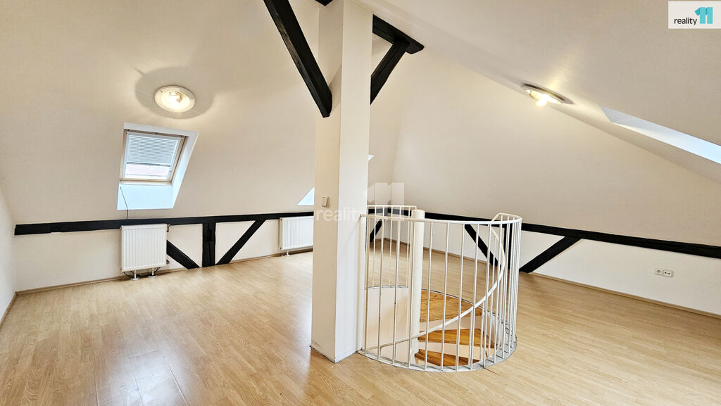 Nabízím pronájem atypického, mezonetového bytu dispozice 2+kk, velikosti 70 m², který se nachází ve zrekonstruovaném podkroví historického domu, přímo v centru města Kolína. Byt zaujme především svoji atmosférou, originálním řešením prostoru a výhledem na Chrám sv. Bartoloměje. Dispozice bytu nabízí prostorný obývací pokoj s kuchyňským koutem, z něhož vede elegantní točité schodiště do dalšího pokoje v patře, dále koupelnu a WC. Vytápění a teplou vodu zajišťuje plynový kotel. Parkování je po dohodě s majitelem možné v uzamykatelném dvoře u domu. V okolí domu je kompletní občanská vybavenost - obchody, zastávky MHD, úřady i služby.