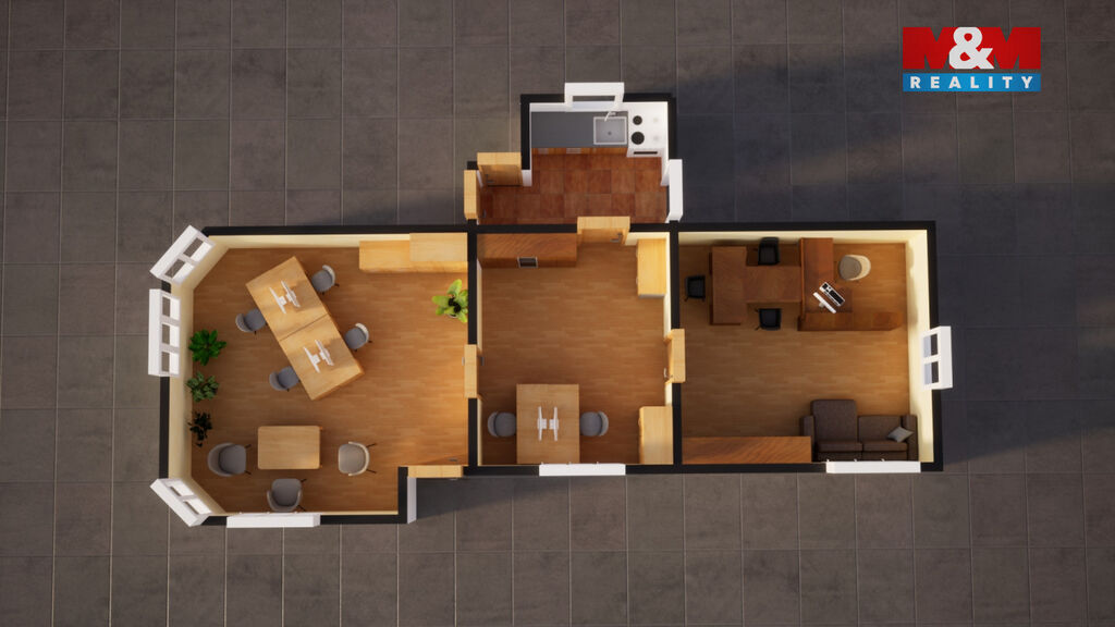 Dispozice nabízí tři samostatných místností, které lze využít jako kanceláře, zasedací prostor nebo klientské zázemí.