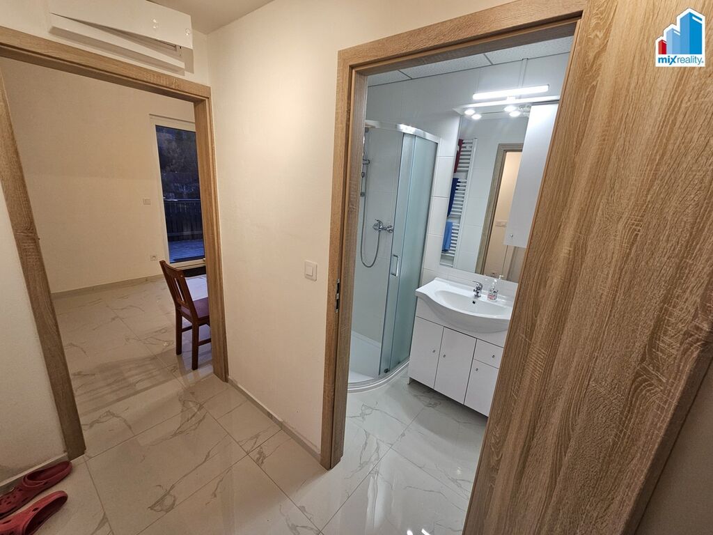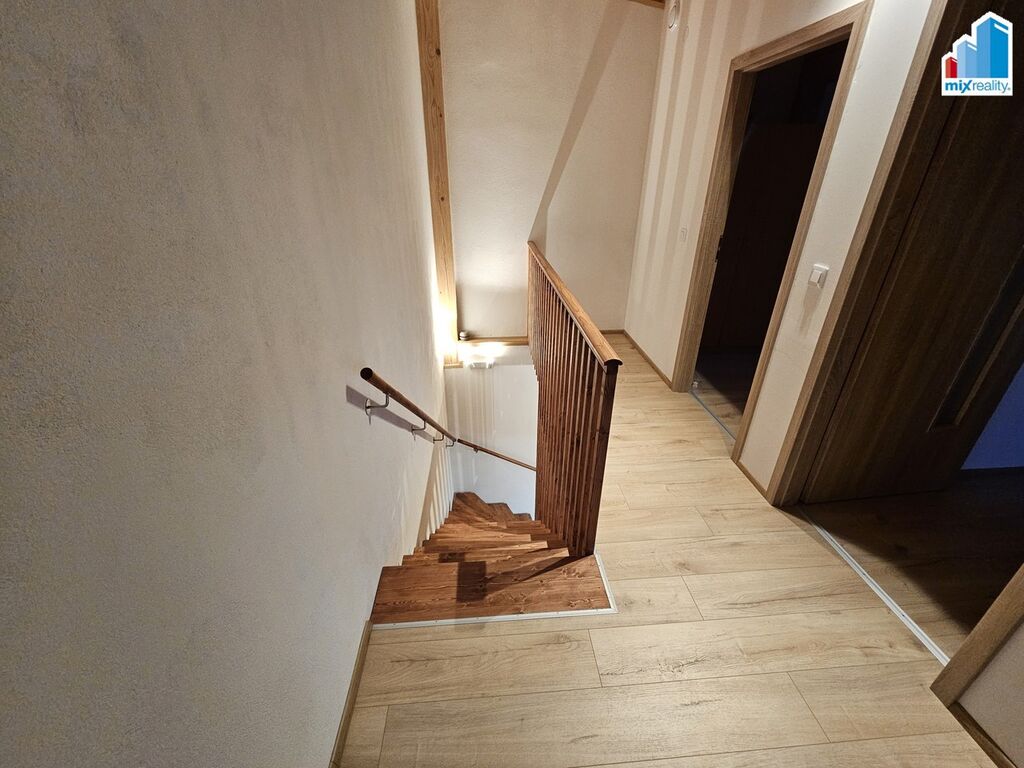 V přízemí se nachází předsíň, prostorný obývací pokoj s kuchyňským koutem a vstupem na terasu, dále koupelna se sprchovým koutem a toaletou.