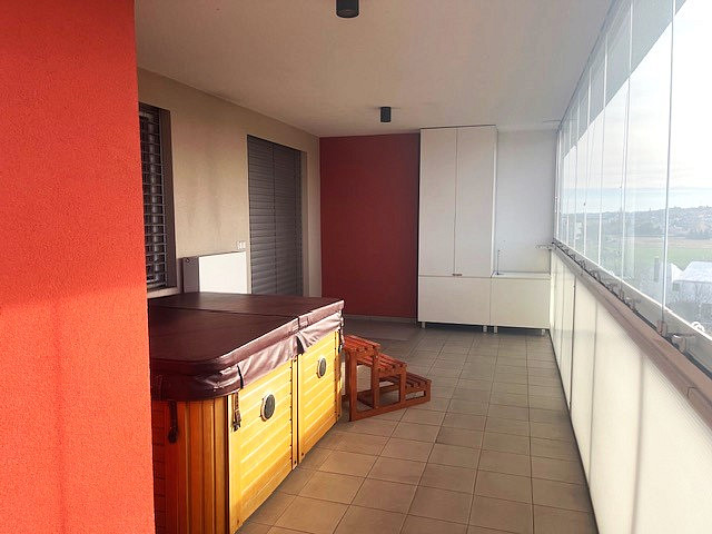 Vzhledem k tomu, že se byt nachází v nejvyšším patře, bylo možné na terasu nainstalovat gril a do obývacího pokoje krbová kamna. Terasu lze nechat uzavřenou nebo zcela otevřít. Rovněž je možné ji celou zastínit proti slunci. Součástí terasy je venkovní gril s posezením, vestavěné skříně na míru a vířivka. Je možné zde umístit i saunu.
