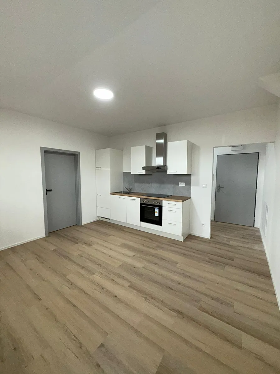 Dispozici bytu tvoří obývací prostor s kuchyňským koutem, vybaveným kuchyňskou linkou a spotřebiči, dále samostatná ložnice a koupelna se sprchovým koutem a toaletou.
