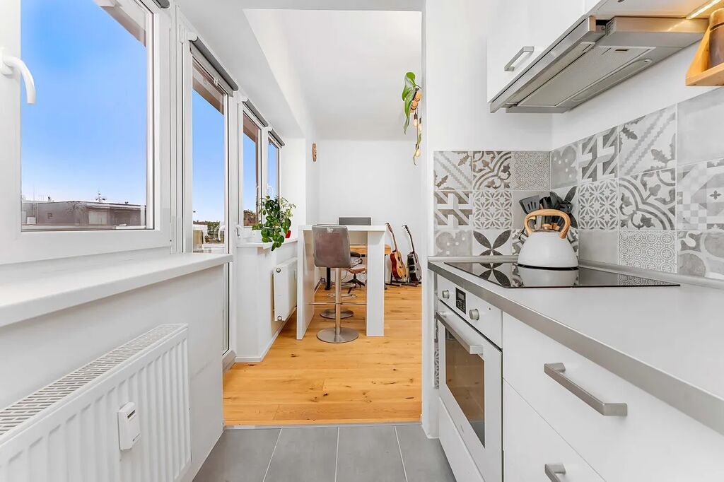 Byt je velké části zařízen (vybavená kuchyňská linka, lednička, pračka, skříně), zaujme také
