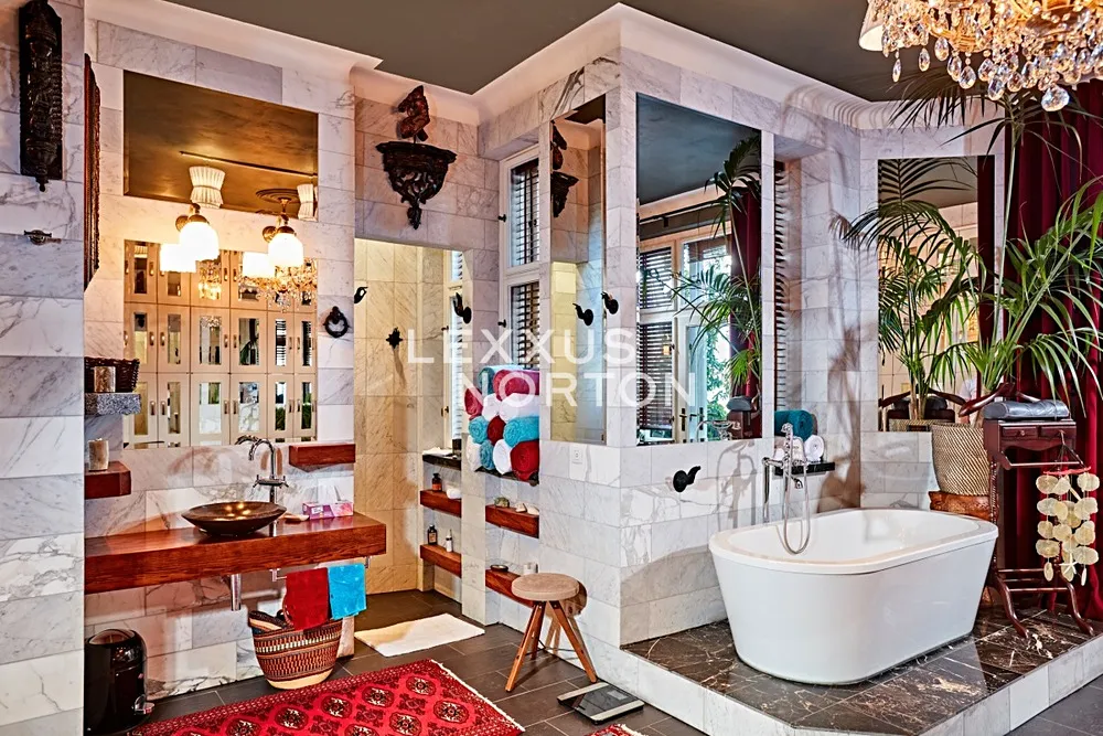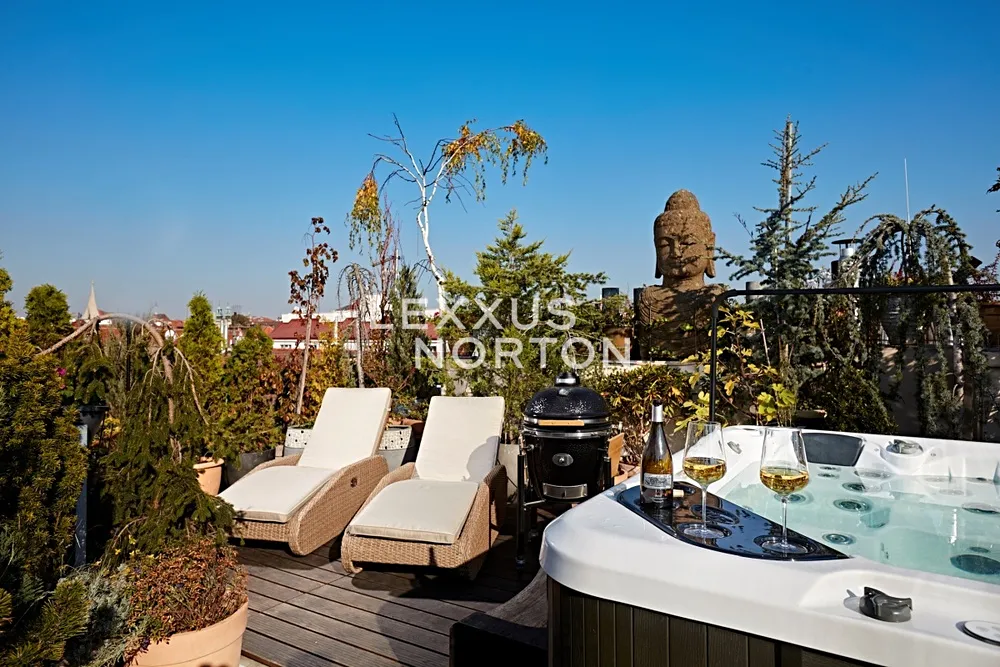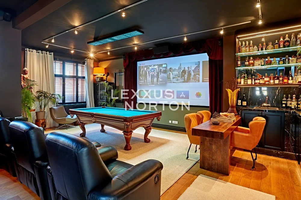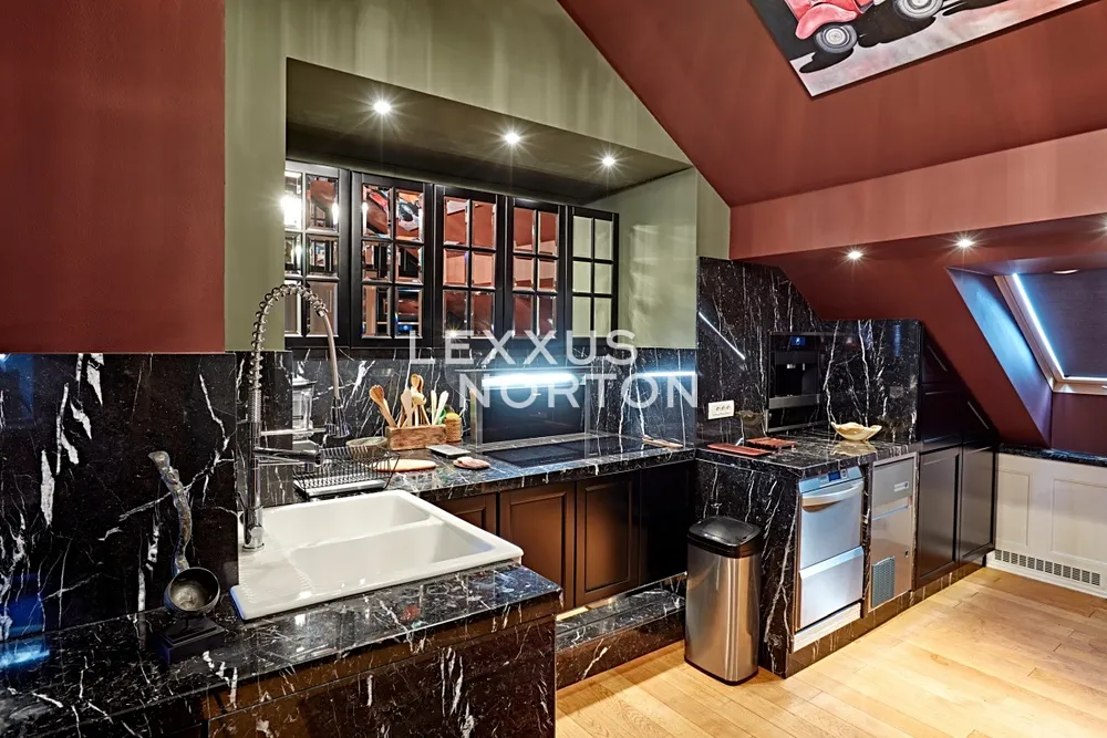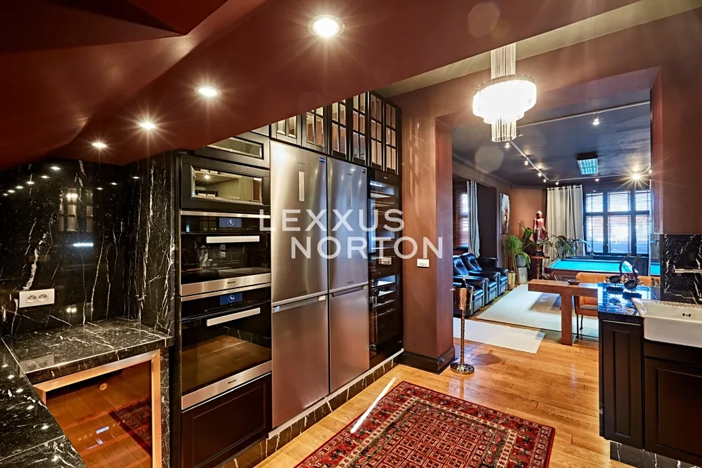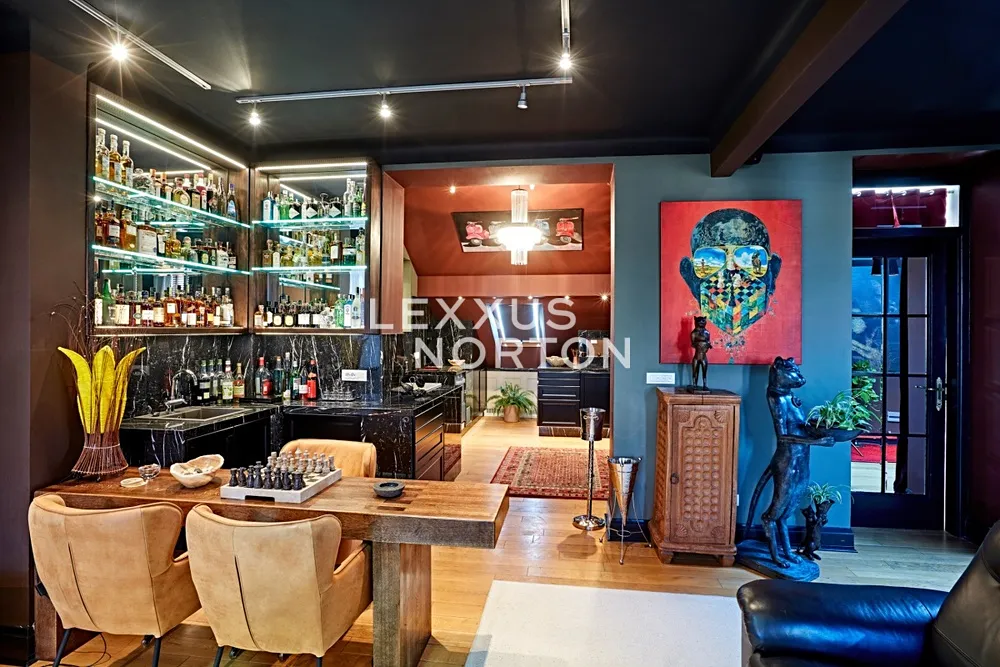 Ze vstupní chodby mezonetu se lze pohodlně přesunout do elegantního obývacího pokoje s jídelním koutem a kompletně vybavenou kuchyní. Dále pak pracovna, ložnice s knihovnou a krbem, koupelna a vstup na balkon. V patře jsou k dispozici 4 elegantní ložnice, 3 koupelny - v jedné z koupelen se nachází sauna a parní lázeň, dále obývací prostor, otevřená galerie, šatna, sauna a střešní terasa 200 m2 s vířivkou. Interiér se vyznačuje prvotřídním zpracováním – masivní dřevěné podlahy, luxusní koberce a designový nábytek z exotických i evropských materiálů vytvářejí harmonický celek, nabízí mimo jiné také kulečník, domácí kino, alkoholový bar, aj.