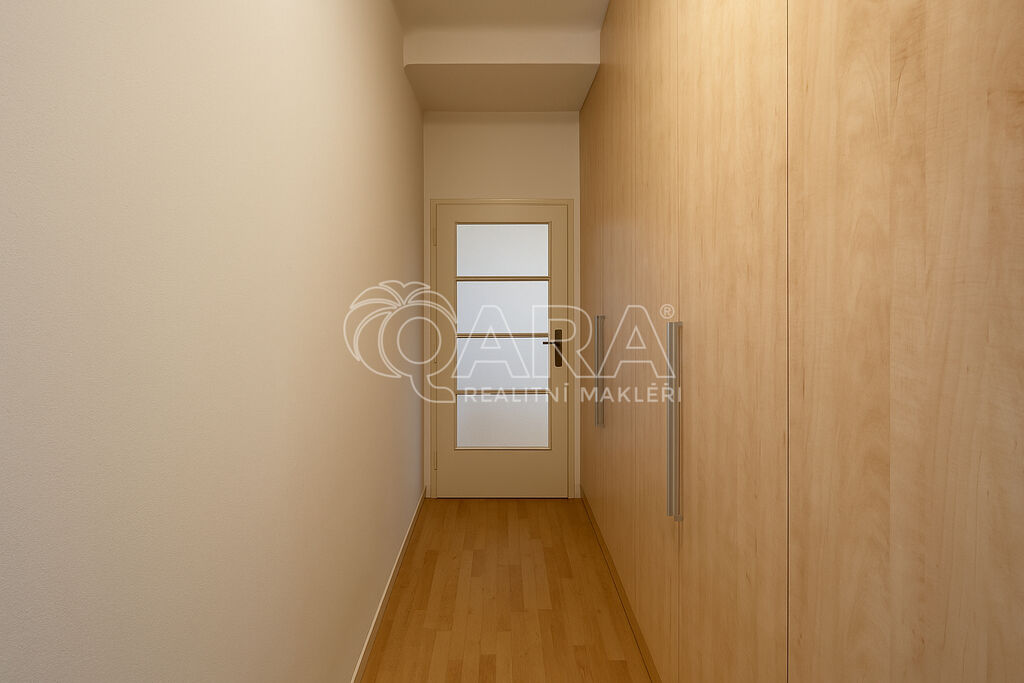Byt má prakticky řešenou dispozici. Vstupní chodba je vybavena vestavěnými skříněmi a navazuje na samostatnou ložnici s postelí, úložným prostorem a přímým vstupem na první balkon. Další průchozí chodba nabízí opět vestavěné skříně a úložné prostory. Koupelna je vybavena vanou a pračkou, toaleta je oddělená. Samostatná kuchyň disponuje veškerými spotřebič a také samostatnou komorou. Na kuchyň navazuje prostorný obývací pokoj se vstupem na druhý balkon a přístupem do další samostatné ložnice, která je rovněž zařízena postelí a vestavěnými skříněmi. V předsíni je navíc další komora, která poskytuje dostatek úložného prostoru.